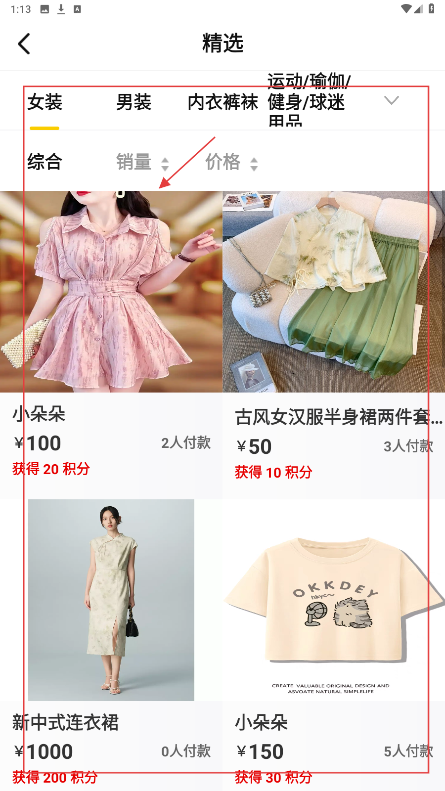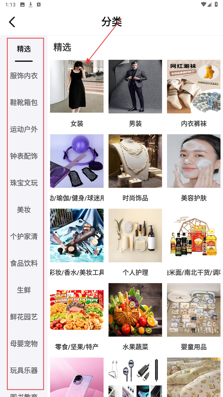 2、在分类页,选感兴趣类目(如女装),进入精选商品列表。