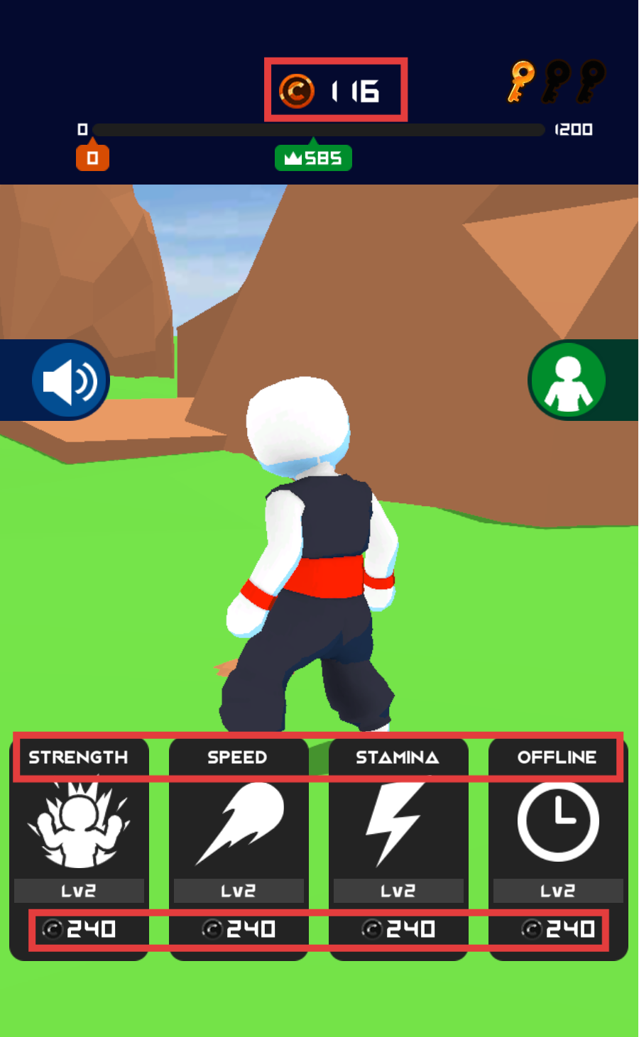 1、优先升级【STRENGTH】、【SPEED】、【STAMINA】、【OFFLINE】属性,消耗【240】货币提升至Lv2,增强角色基础能力。