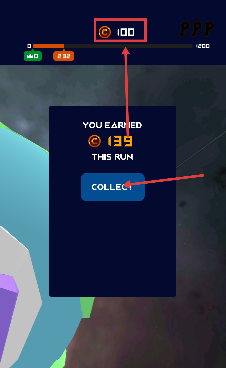 4、通关后点击【COLLECT】按钮,领取【YOU-EARNED-139-THIS-RUN】的货币,积累资源用于后续属性升级。