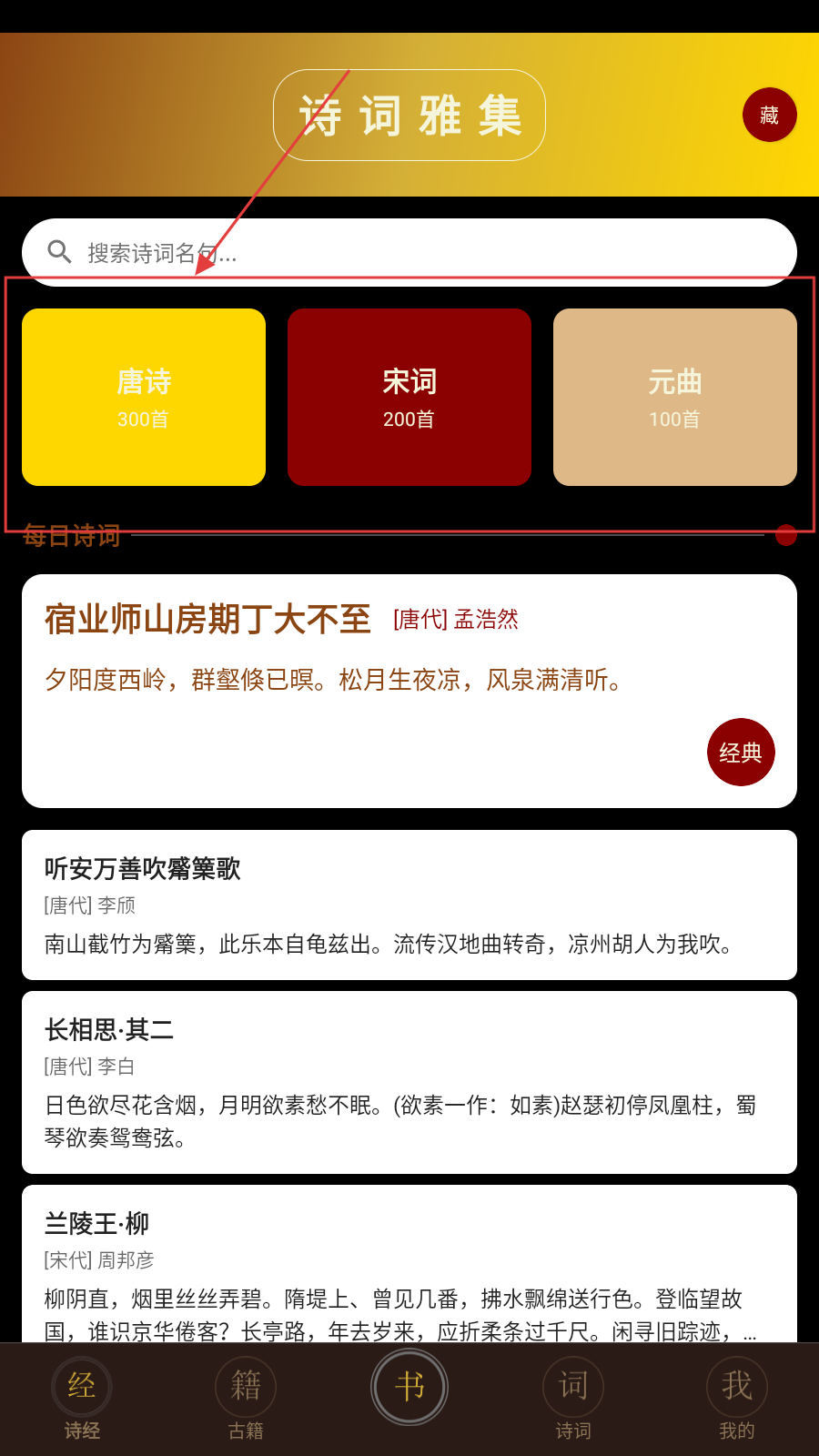1、进入【诗词雅集】,想读唐诗选黄色【唐诗-300首】,快速进入唐诗学习。