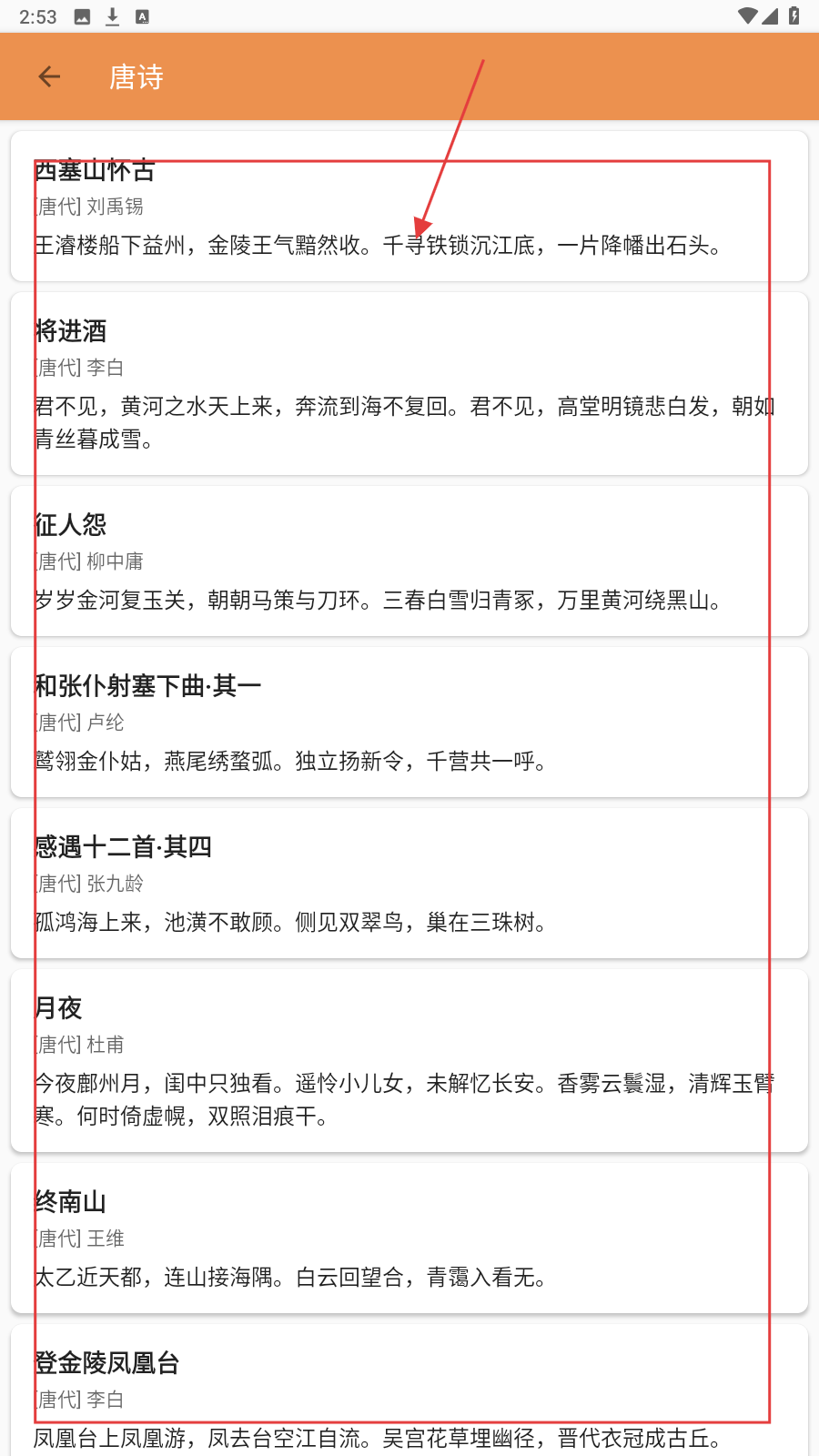 2、在唐诗列表,找感兴趣的诗,如【西塞山怀古】,点击查看诗词全文。