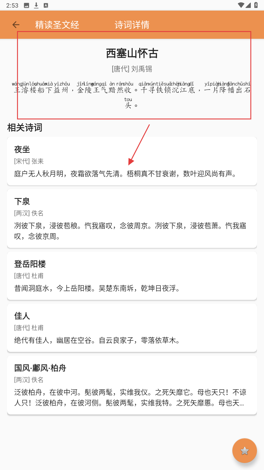 3、进入诗词详情页,精读【西塞山怀古】,看注释、品诗意,理解刘禹锡作品。读完主诗词,下滑看【相关诗词】进行选择,如【夜坐】。
