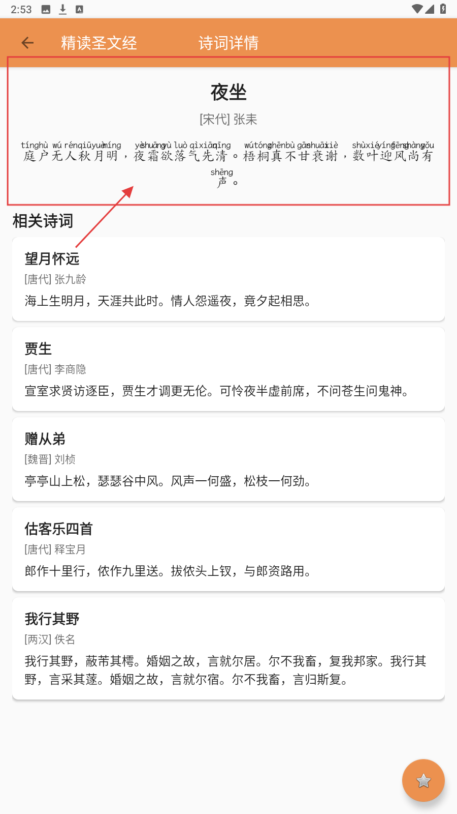 4、进入【夜坐】内容界面继续读宋代张耒的诗拓展学习。