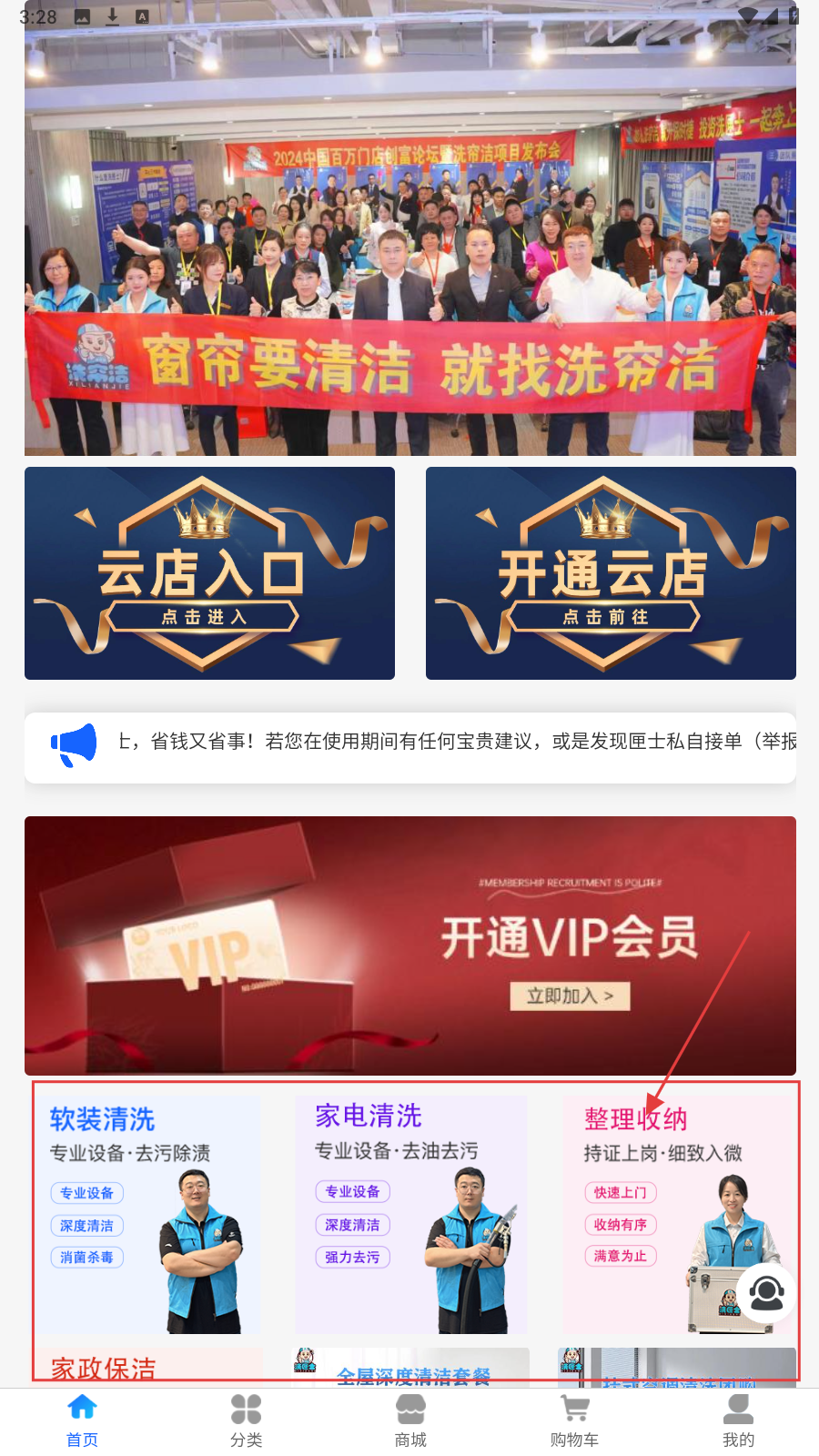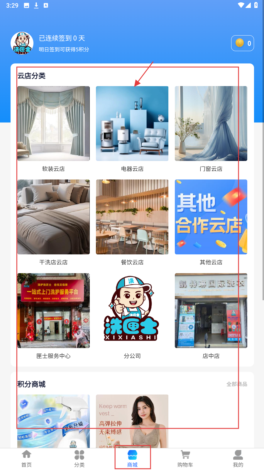 4、切换到【商城】,逛【云店分类】,选软装、电器等云店拓展服务。