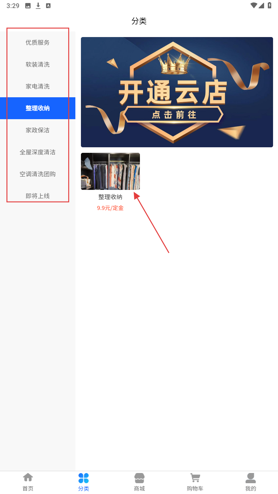2、在【分类】栏点【整理收纳】,选9.9元定金项目,查看服务内容。