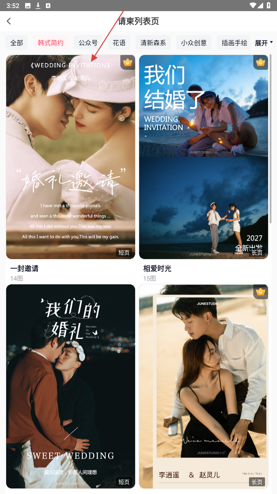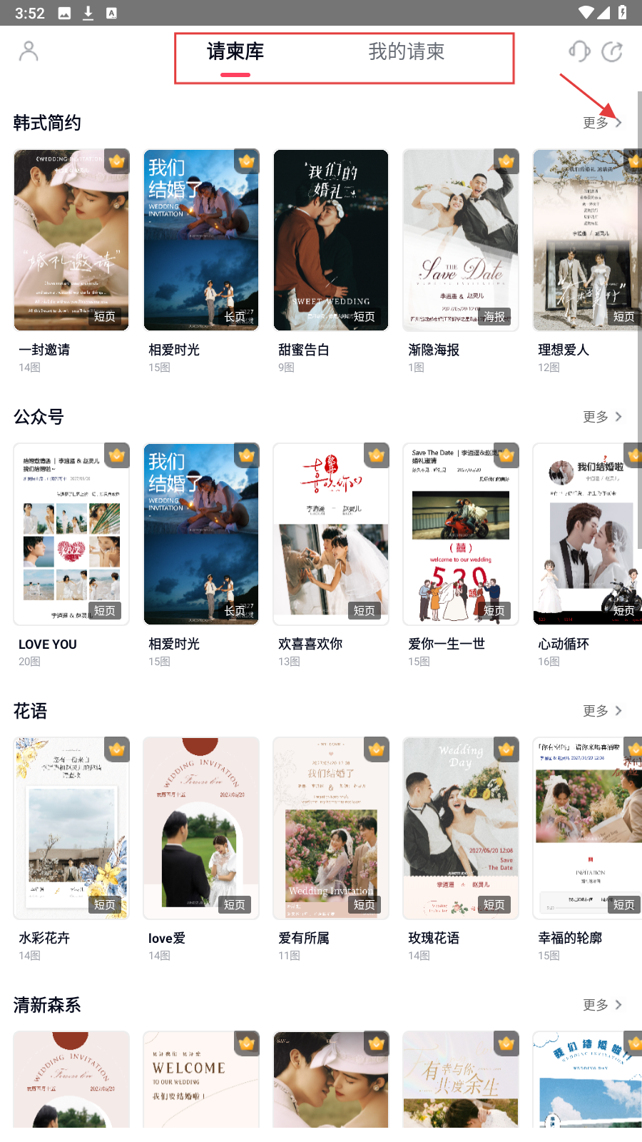 1、进入【请柬库】,选【韩式简约】分类,点【更多】看全部模板。