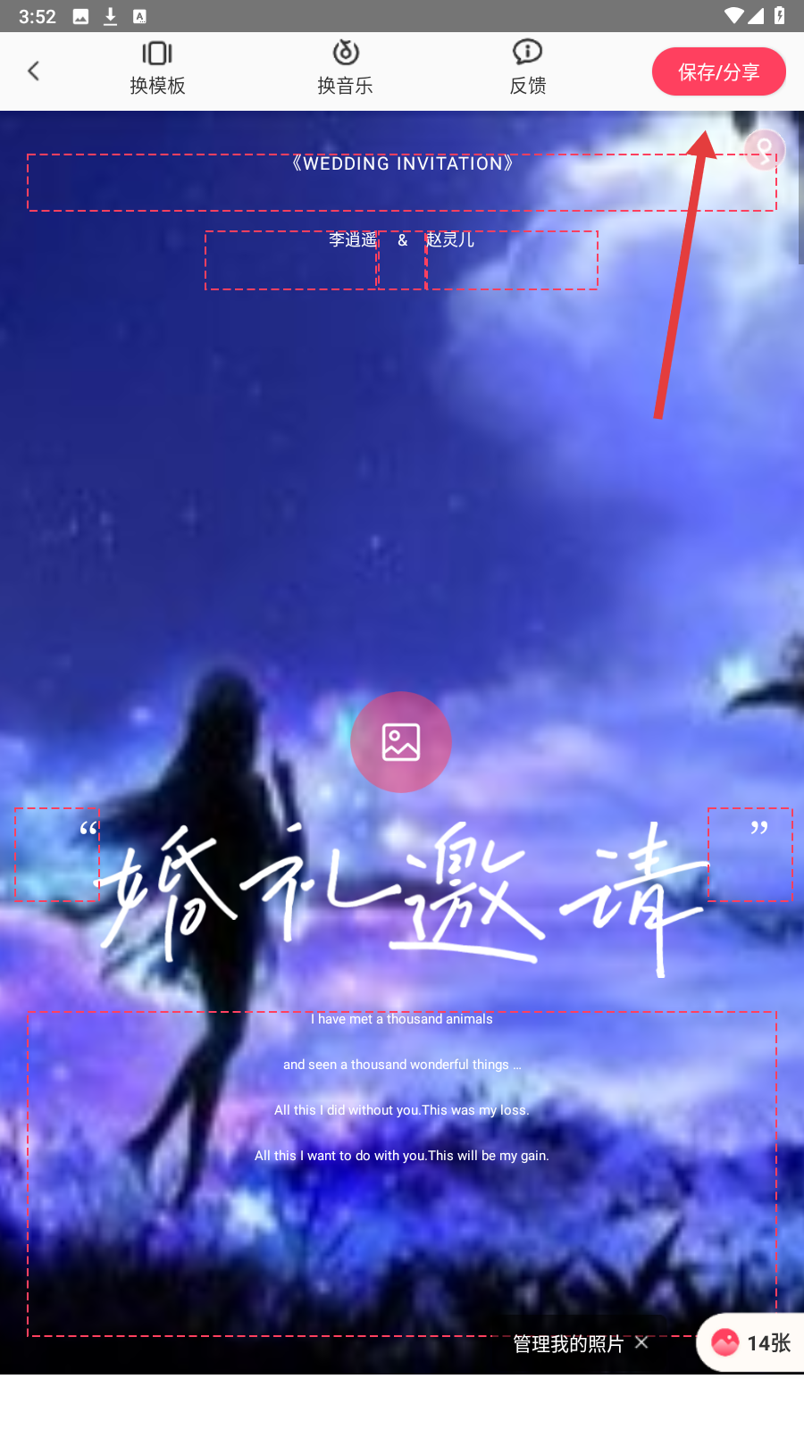 4、编辑页替换照片、改文字,完成后点【保存/分享】,导出请柬。