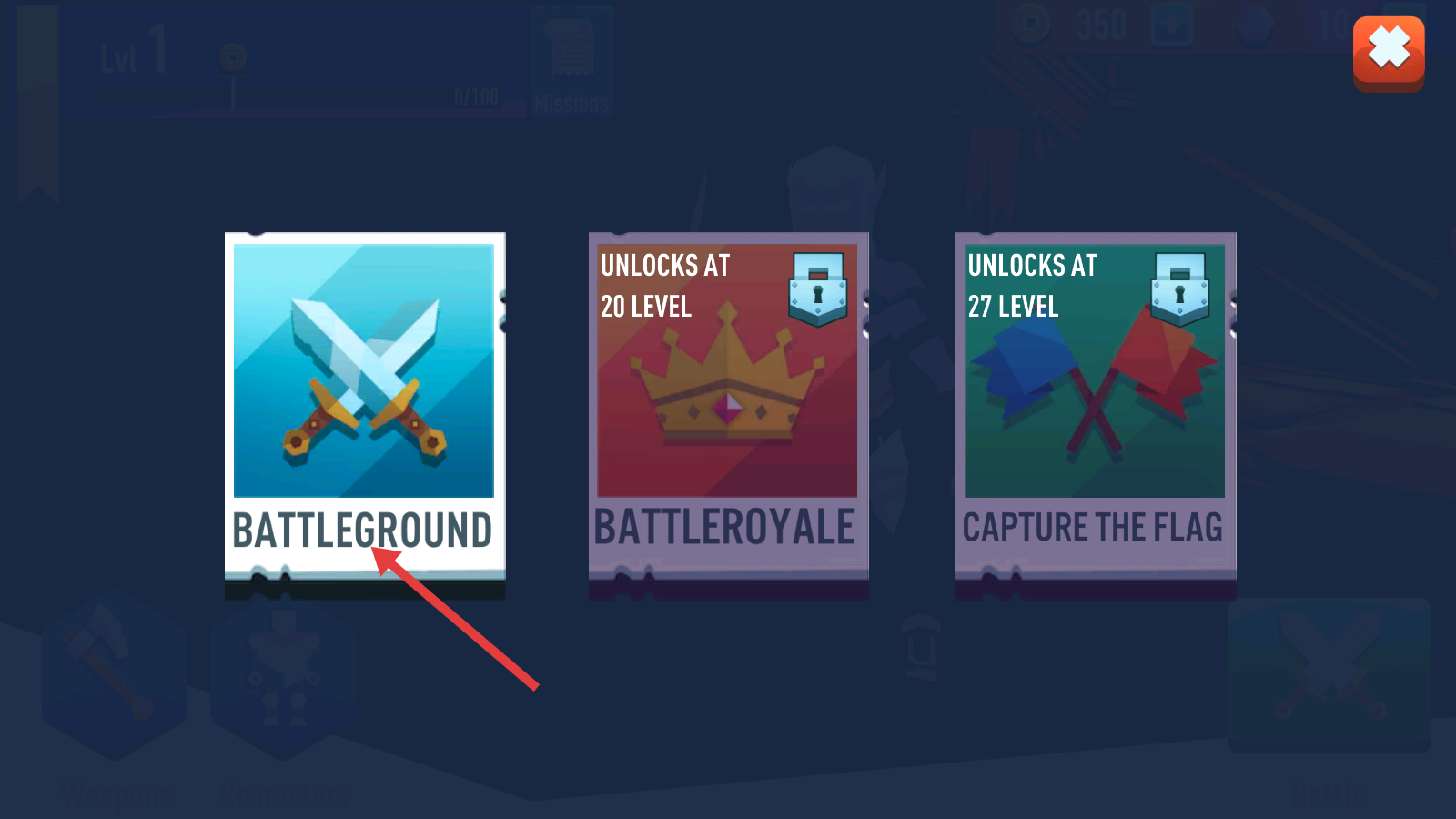 1、选择【BATTLEGROUND】模式开始游戏,其他模式需等级解锁,优先熟悉基础对战玩法。