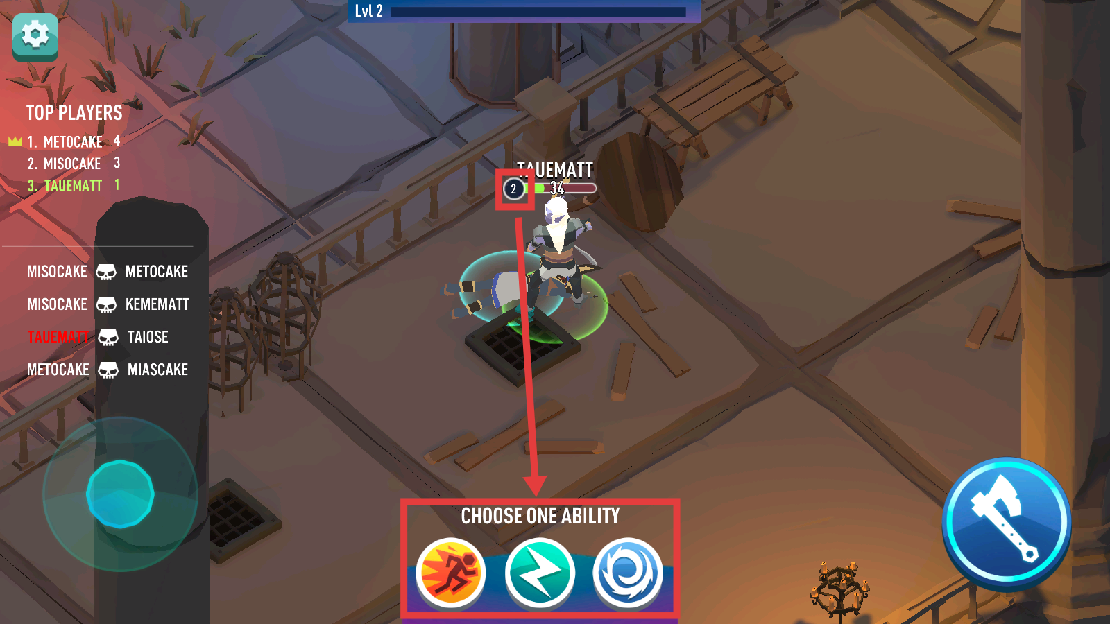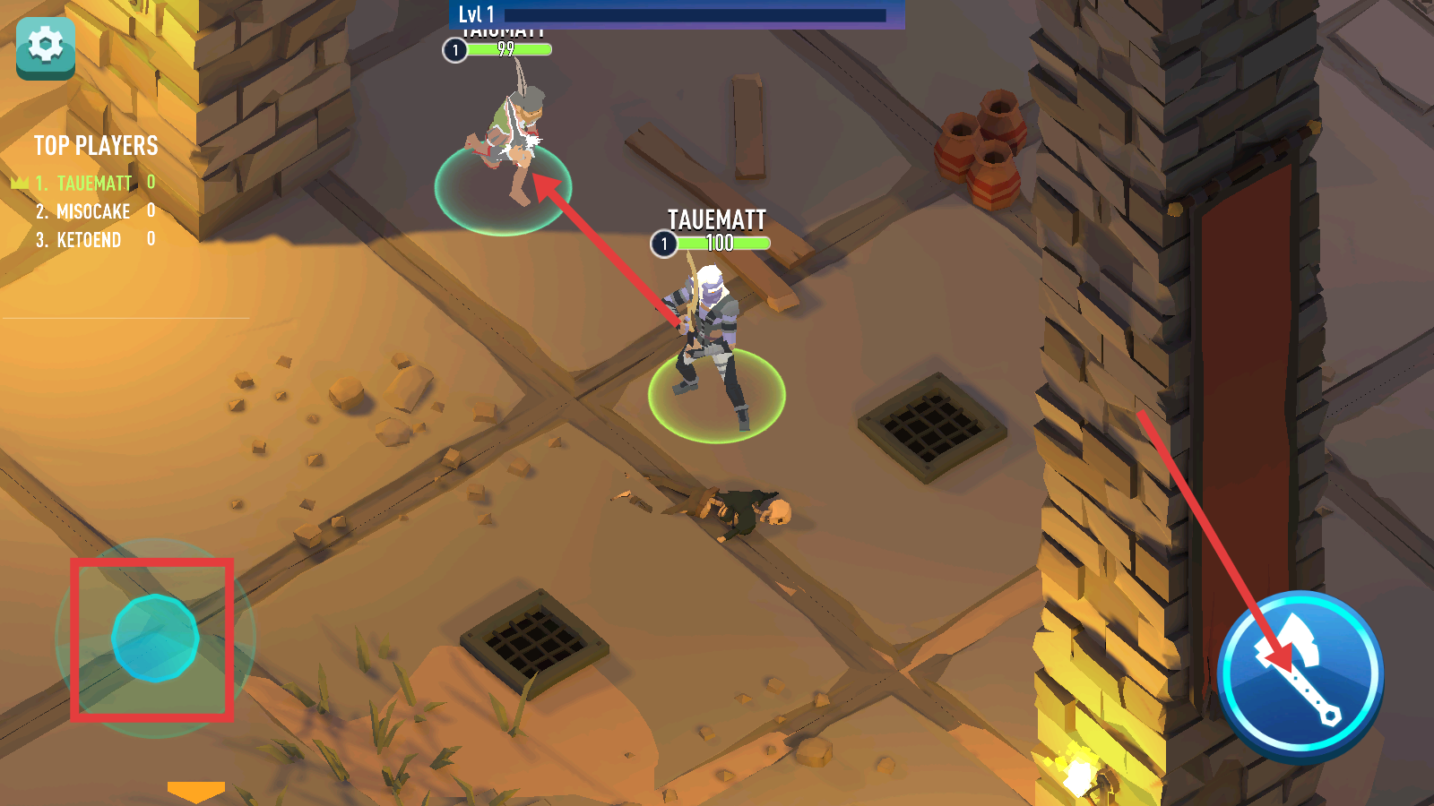 2、左侧摇杆移动角色,右侧【斧头】按钮攻击敌人,留意对手血量与自身站位,合理输出。