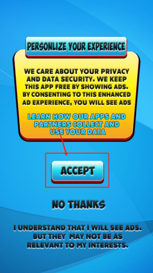 1、接受广告条款:在游戏启动界面,阅读并点击“ACCEPT”接受广告条款,以继续游戏。