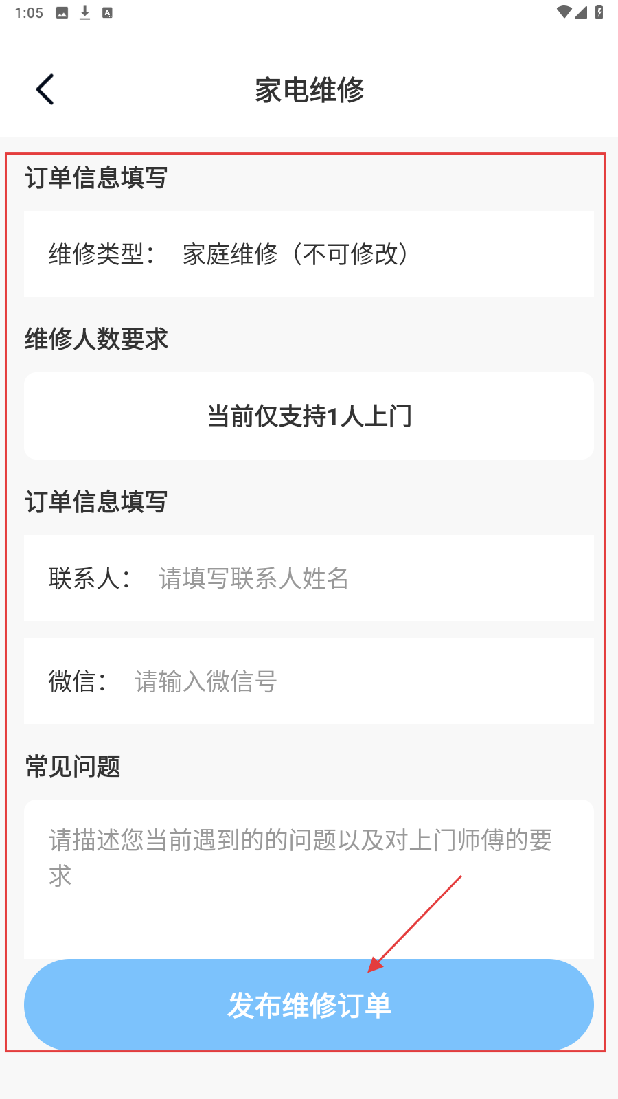 2、填好维修类型、联系人等信息,描述问题后点【发布维修订单】提交需求。