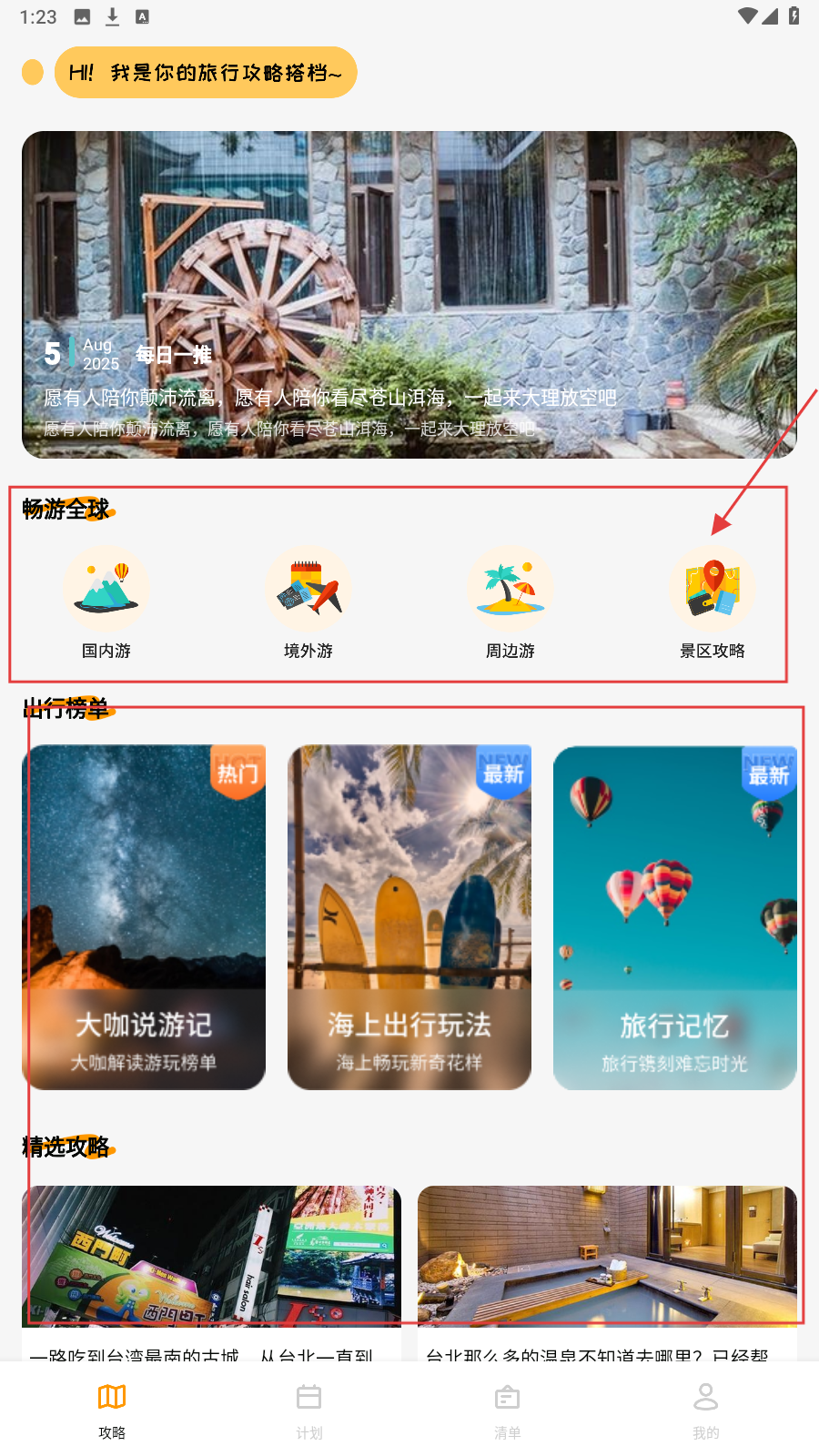 1、打开应用,在首页有国内游、境外游等功能按钮,选择需要查看的功能并点击,如【景区攻略】。