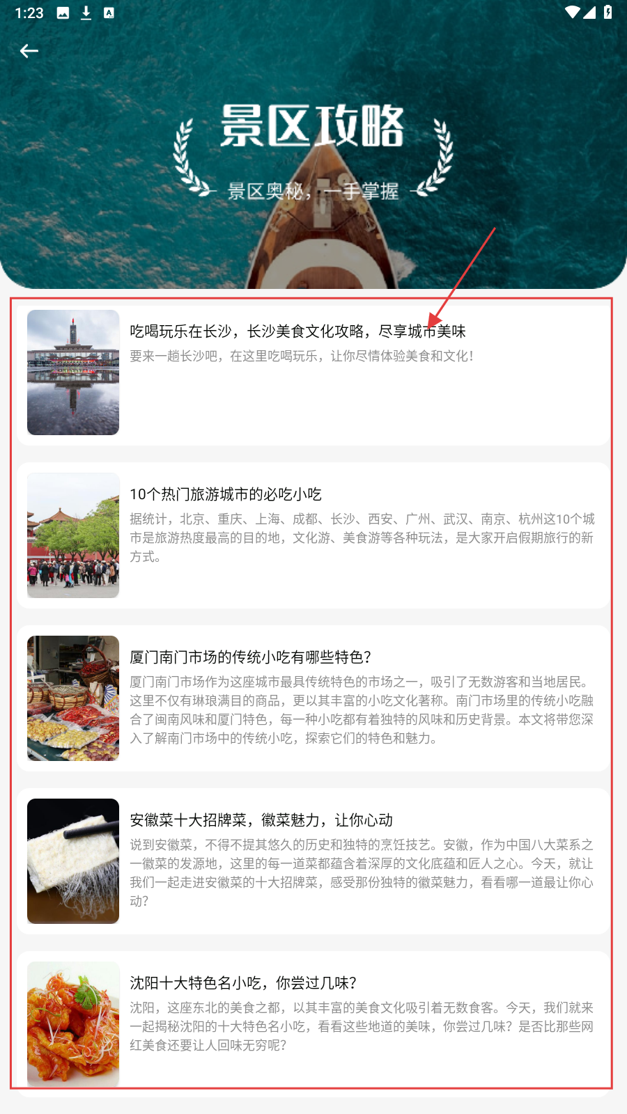2、进入【景区攻略】,浏览长沙美食、热门城市小吃等攻略文章。点感兴趣的攻略(如长沙美食攻略)。