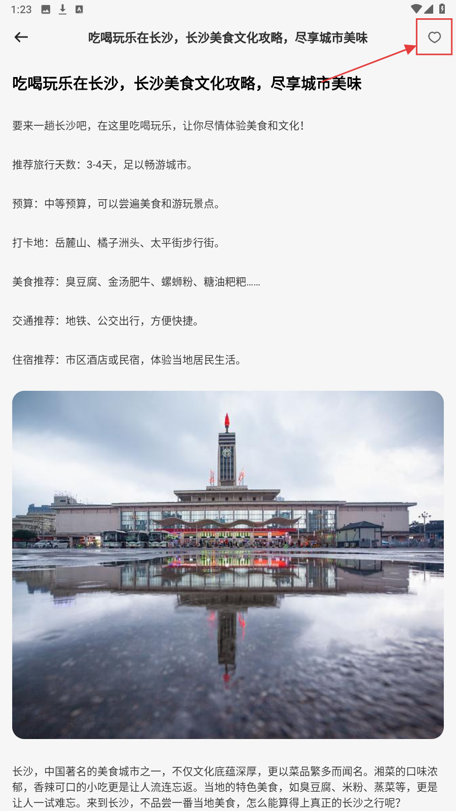 3、在攻略详情页,查看旅行天数、预算、打卡地等信息,点右上角【爱心】,可收藏该攻略方便后续查看。