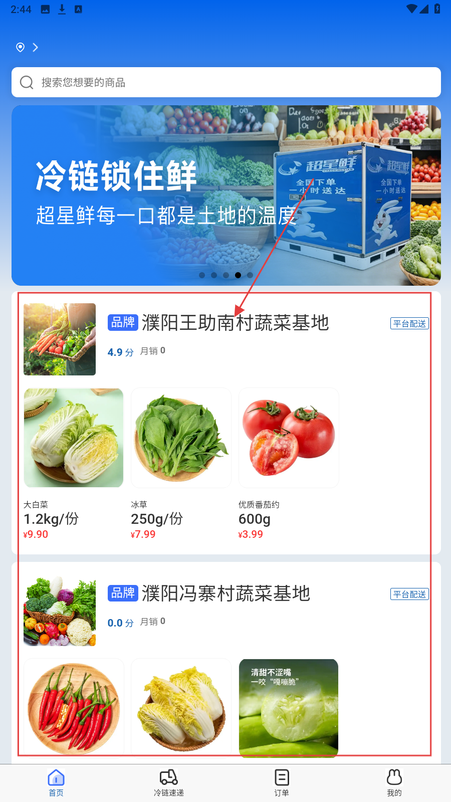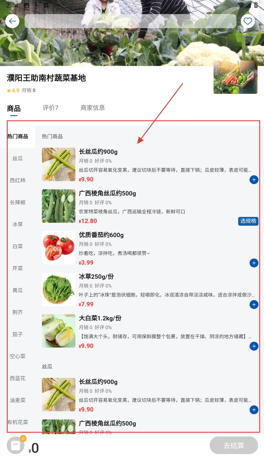 1、进入首页,选蔬菜基地(如濮阳王助南村蔬菜基地),查看商品。