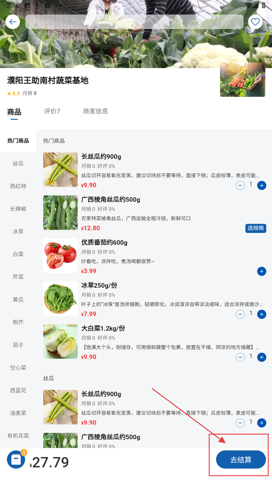 2、在基地商品页,选心仪蔬菜(如长丝瓜等),点【+】加入购物车。