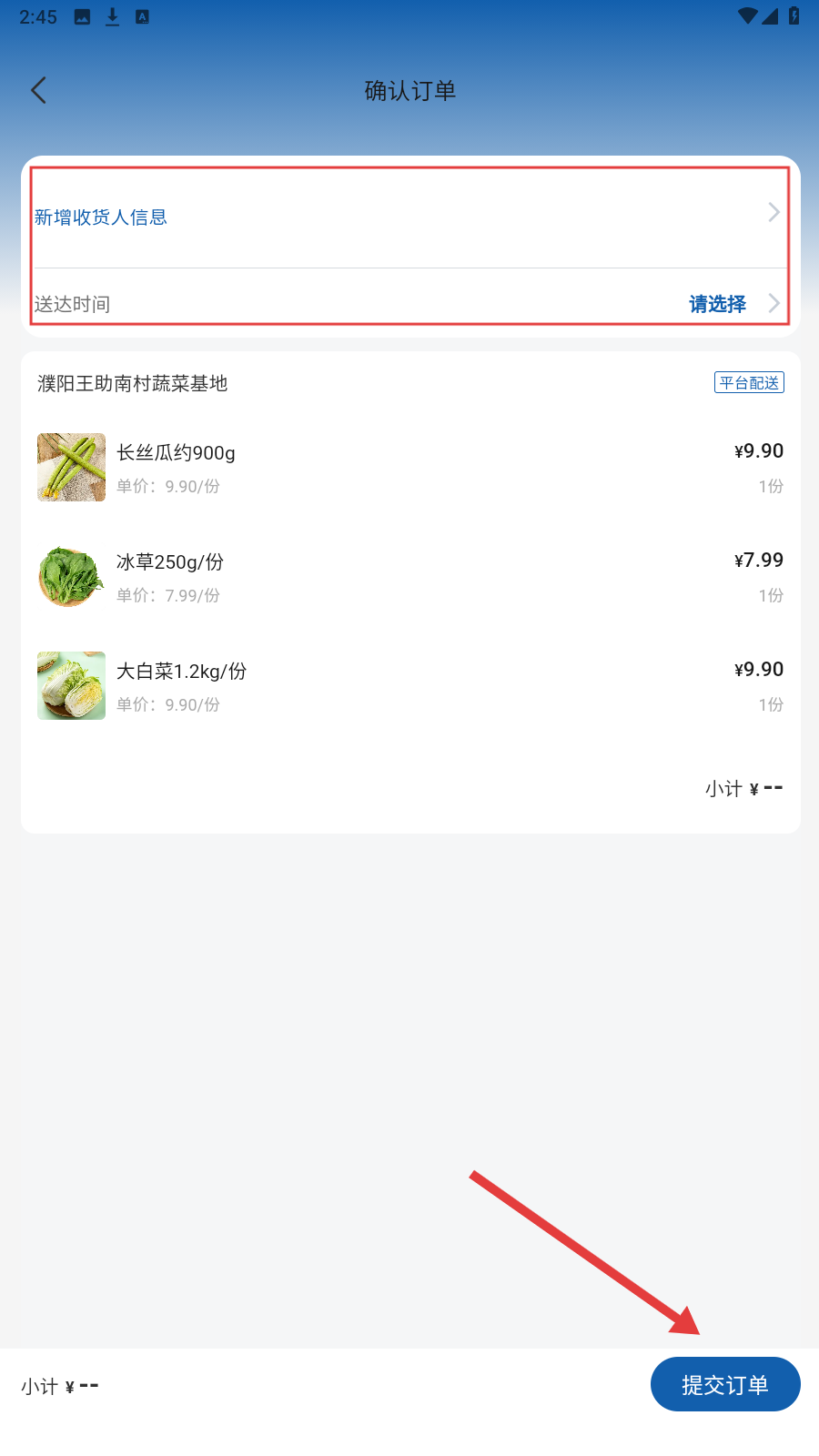4、填收货信息、选送达时间,点【提交订单】完成购买。