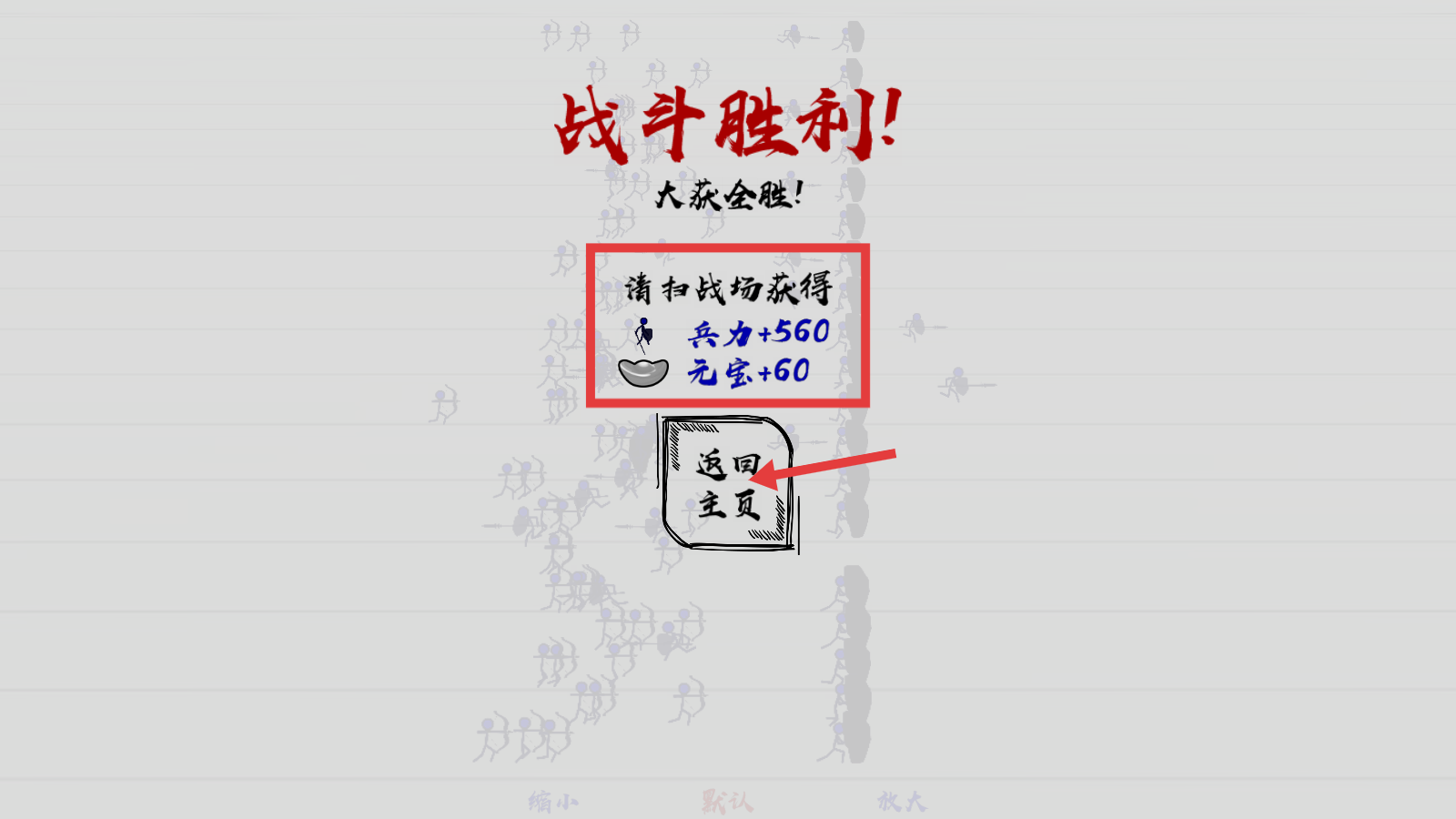 4、战斗胜利后【清扫战场获得-兵力+560-元宝+60】,点击【返回主页】按钮准备后续挑战。