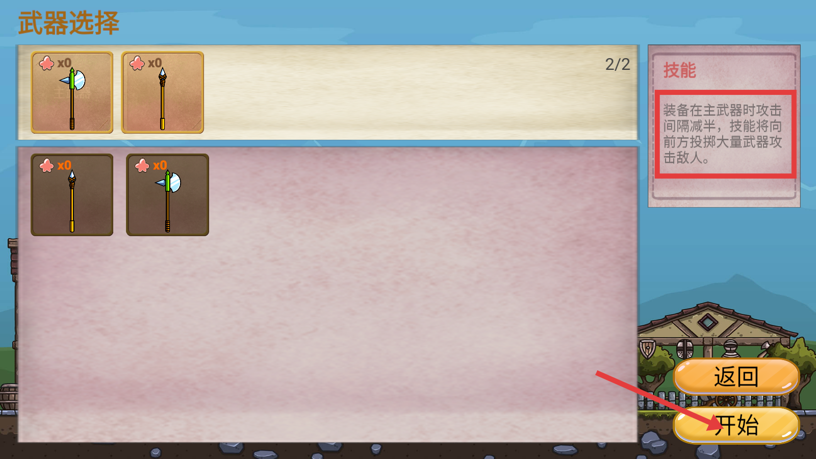 2、在【武器选择】界面挑选武器,了解右侧【技能】说明后,点击【开始】按钮进入战斗阶段。