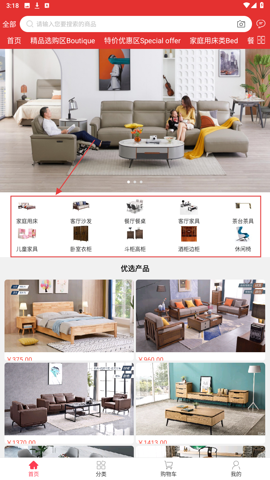 1、进入【首页】,选家具分类(如家庭用床等),精准找商品。