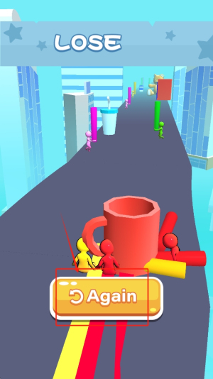 3、游戏结束:如果角色碰到障碍物,游戏会结束,显示“LOSE”。此时可以选择点击“Again”按钮重新开始游戏。