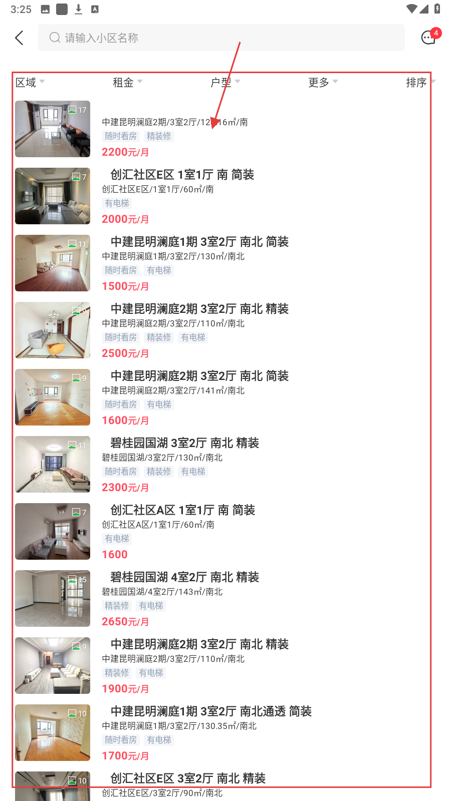 2、在房源列表,挑感兴趣房屋(如中建昆明澜庭2期等),看详情。