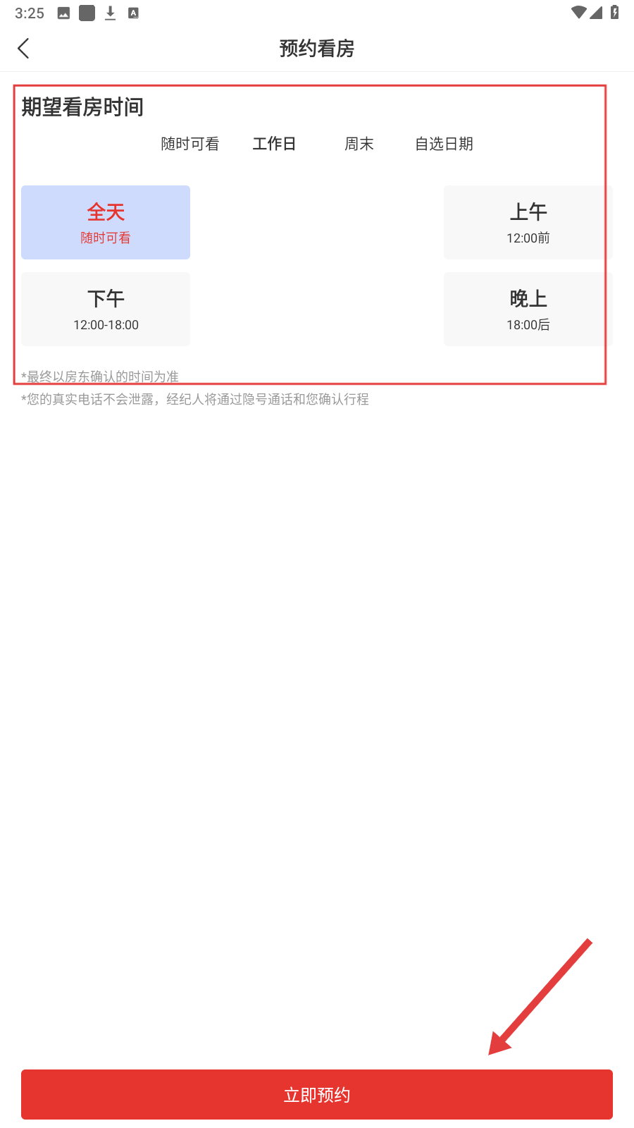 4、确认看房时间(全天/上午等),点【立即预约】完成流程。