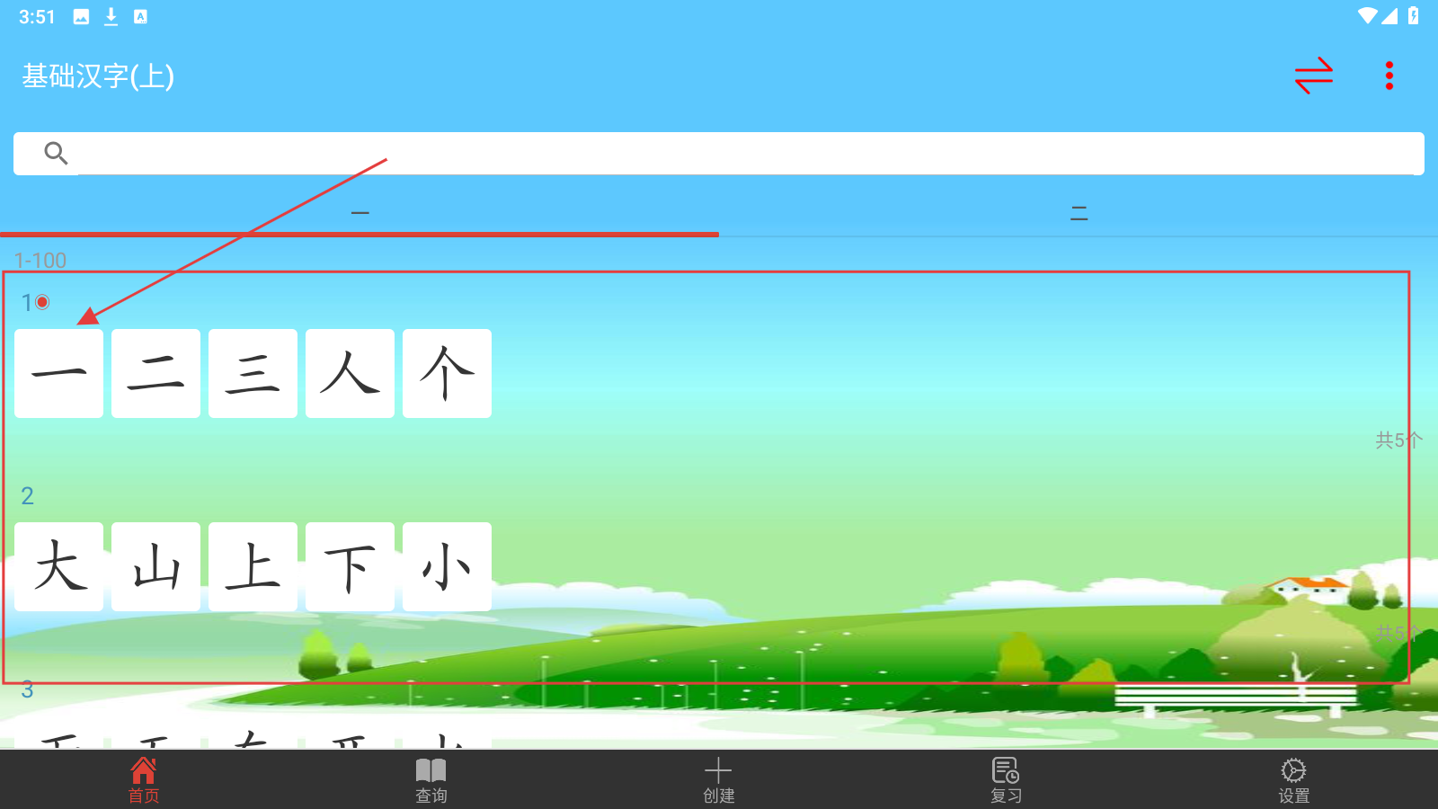 1、进入【基础汉字(上)】界面,选择要学的汉字,如【一】,开启汉字学习之旅。