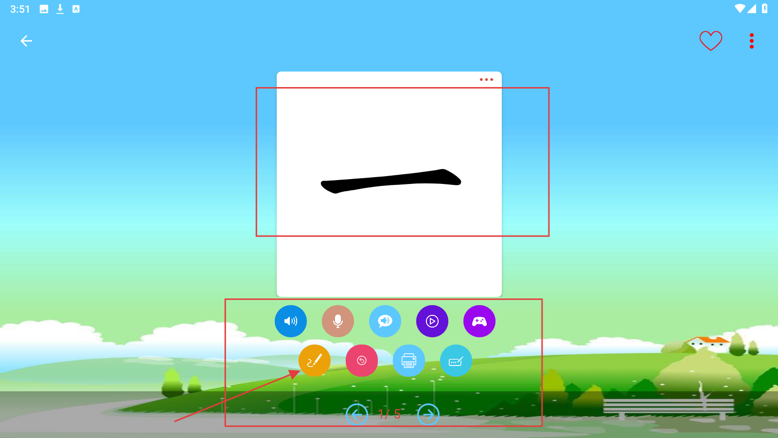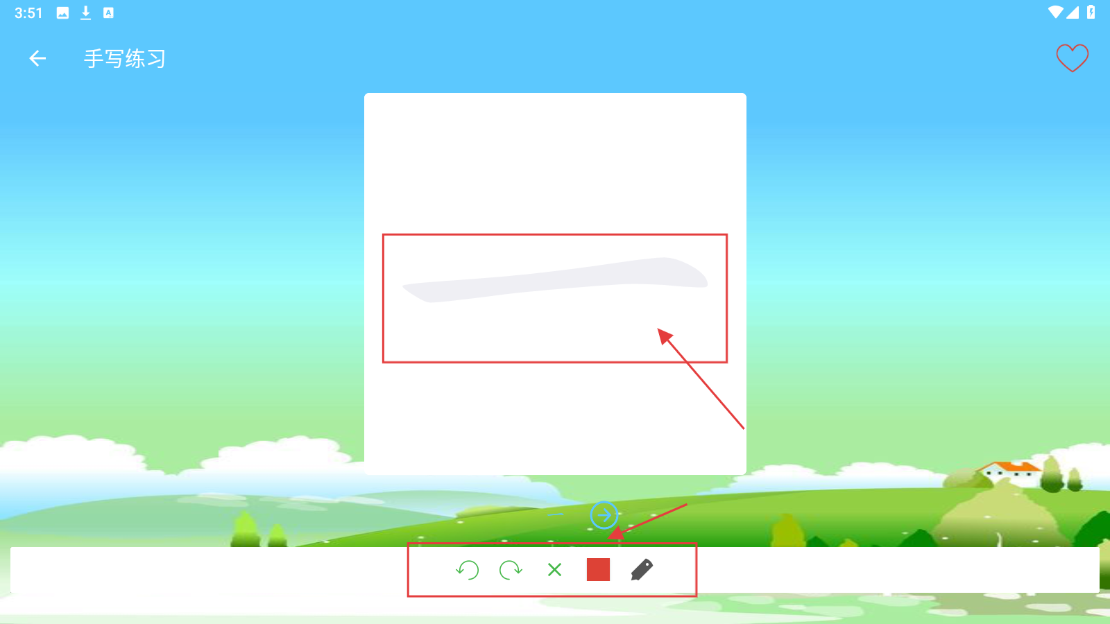 3、手写练习时,依据提示描摹笔画,用下方工具调整,完成【一】字书写练习。