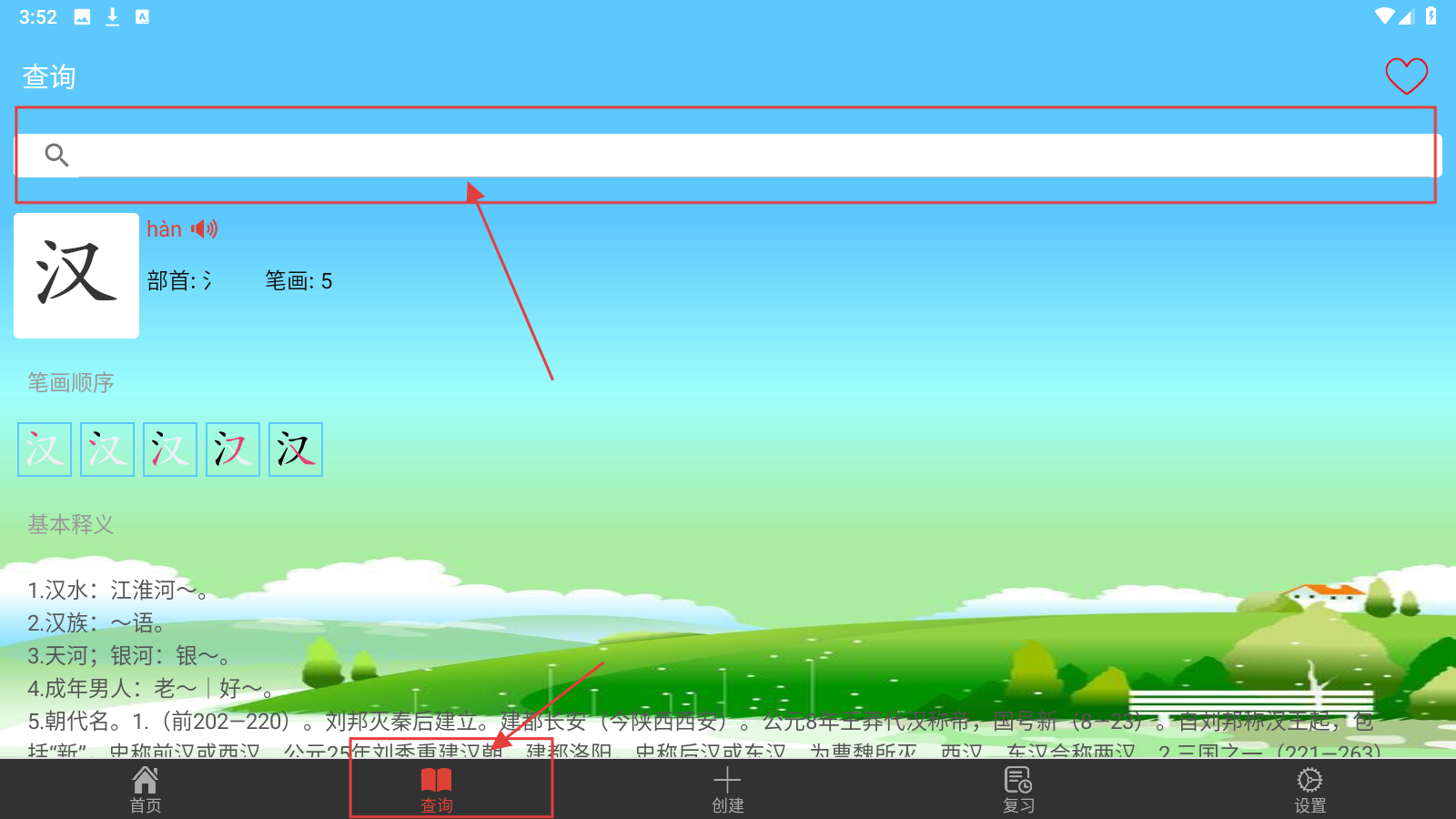 4、进入【查询】页面,在搜索栏输入汉字如【汉】,查看读音、笔画、释义等内容。