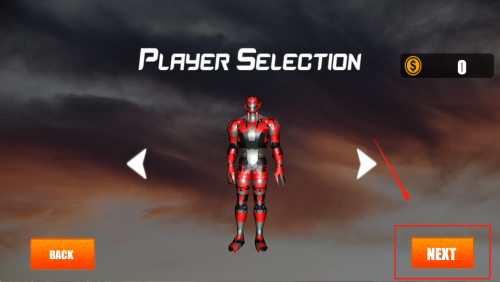 2、选择角色:进入“PLAYER SELECTION”界面,点“NEXT”切换角色,确认后点“BACK”返回主菜单。