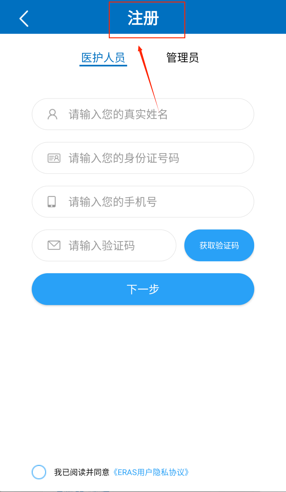 3、新医护注册看这里哟,选"新用户注册"切到注册页,在"医护人员"标签下填姓名身份证号,手机收验证码后勾协议点下一步。
