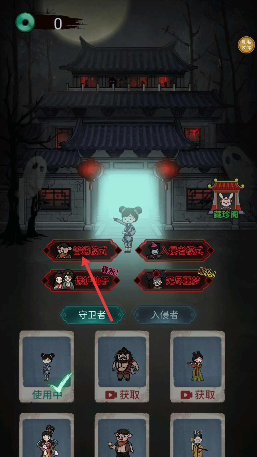1、进入游戏选【普通模式】,以【守卫者-使用中】角色开启游戏,体验经典玩法流程。