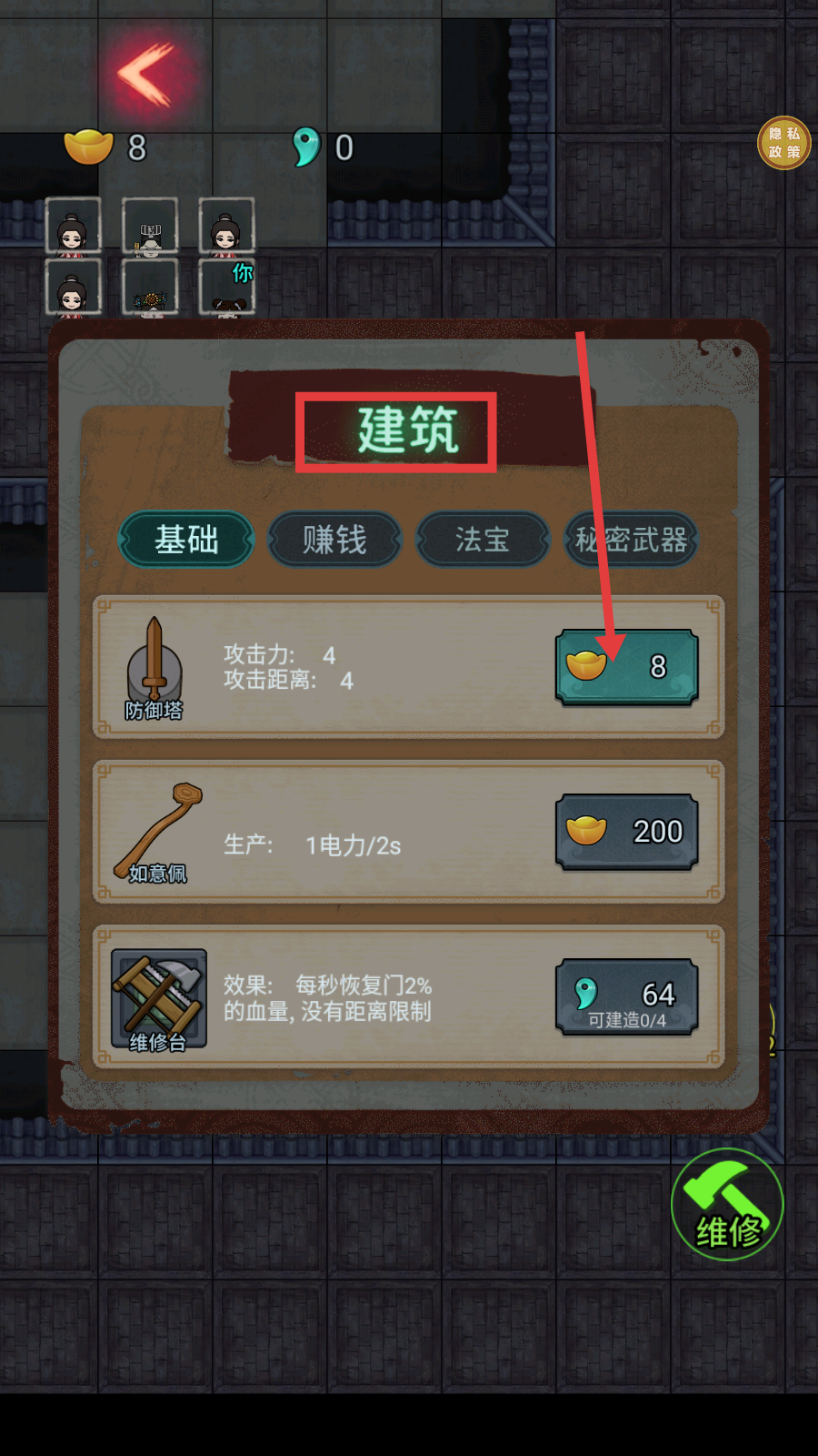 3、打开【建筑】界面,花8元宝建【防御塔-攻击力:4-攻击距离:4】,提升攻防能力。