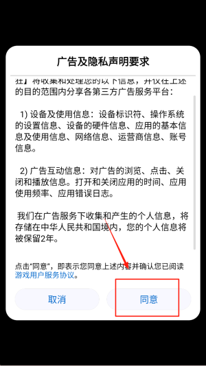 4、确认广告隐私声明:阅读广告及隐私声明后,点击“同意”即可正式进入游戏。