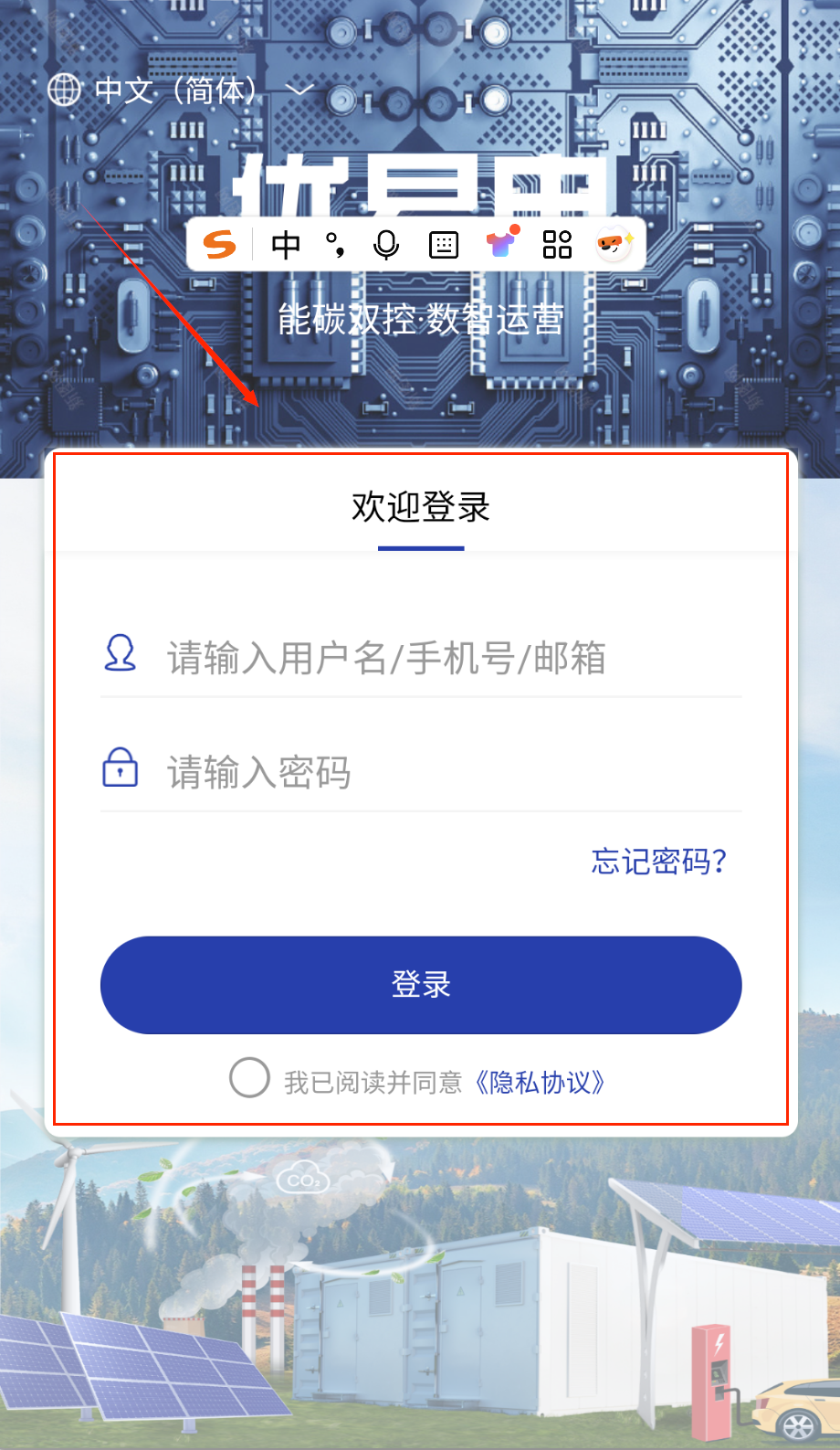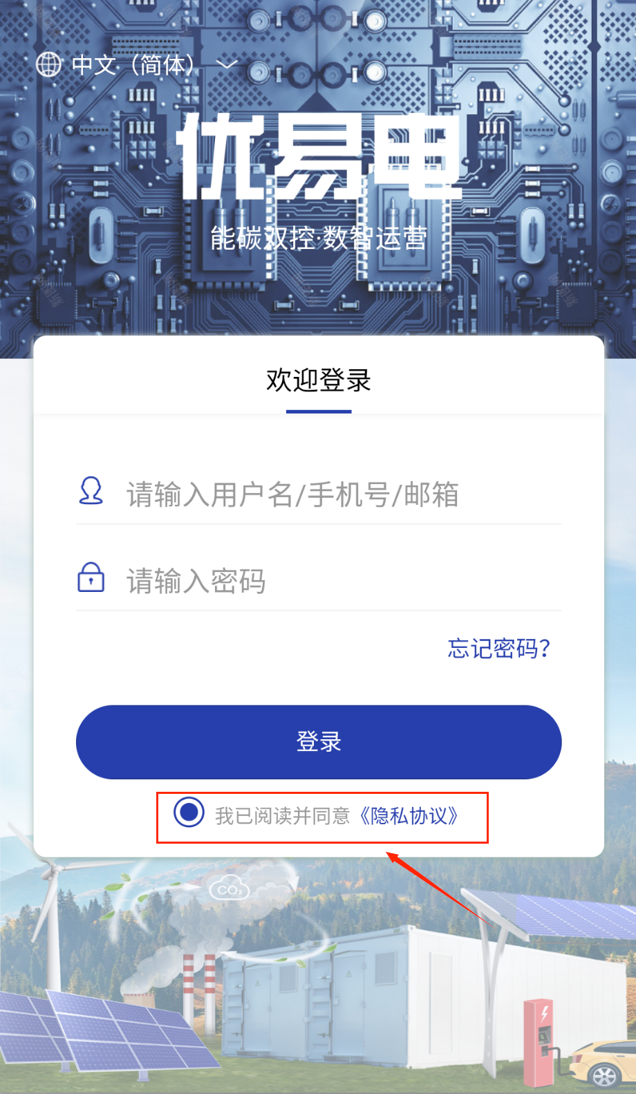1、打开APP进入登录页,顶部显示时间状态,中间是"优易电 能碳双控 数智运营"欢迎语呀。用户名支持手机号、邮箱等多种方式登录哦。
