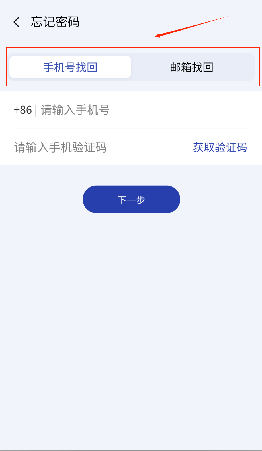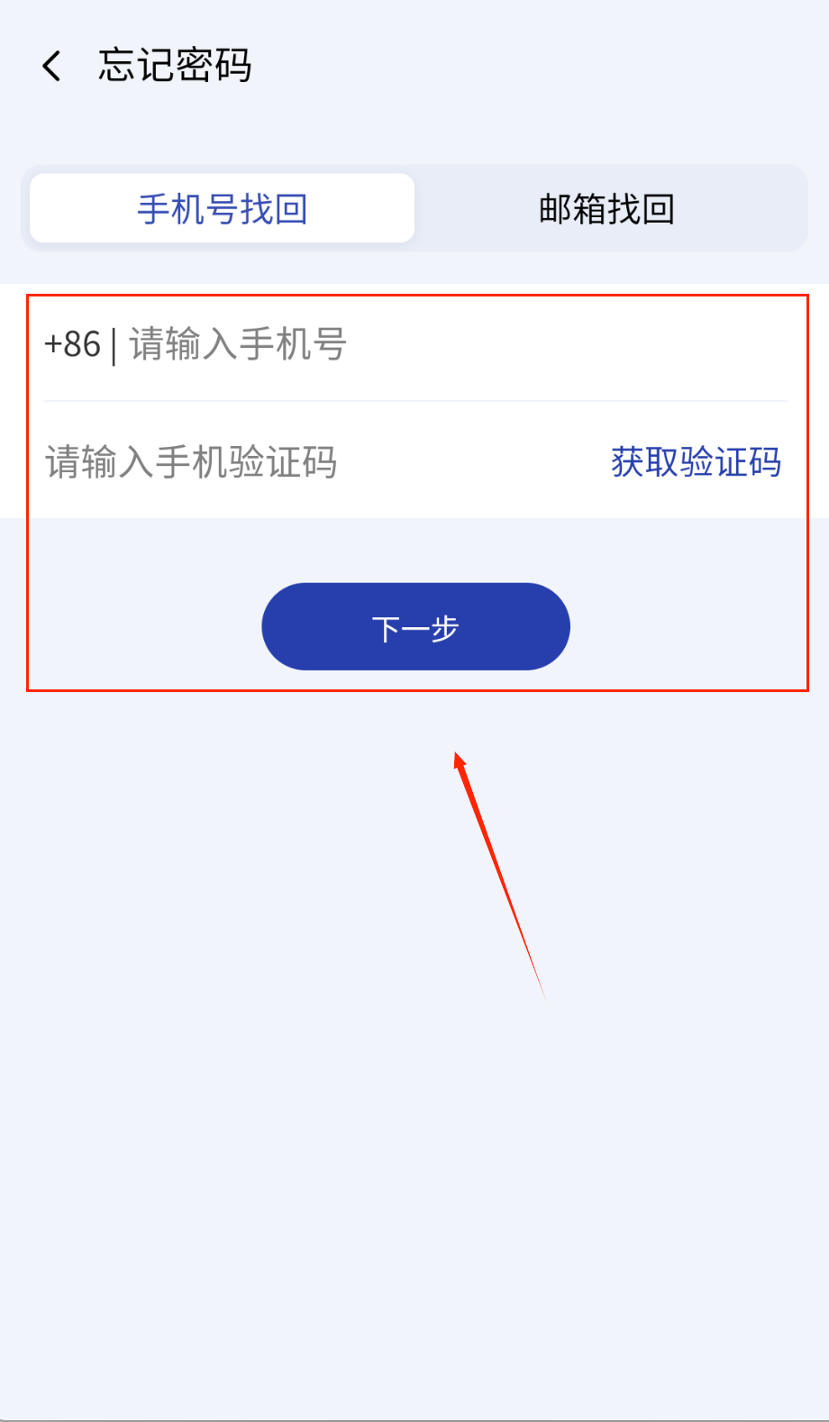 3、忘记密码点击对应链接,选择手机或邮箱找回。手机找回需输入+86号码,获取并填写6位验证码呀。