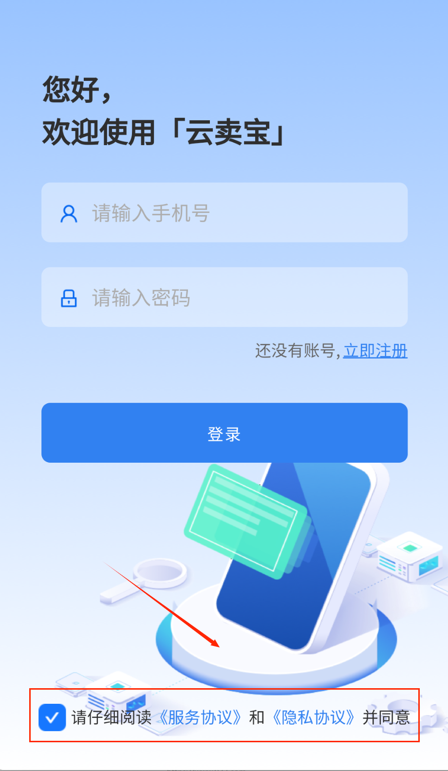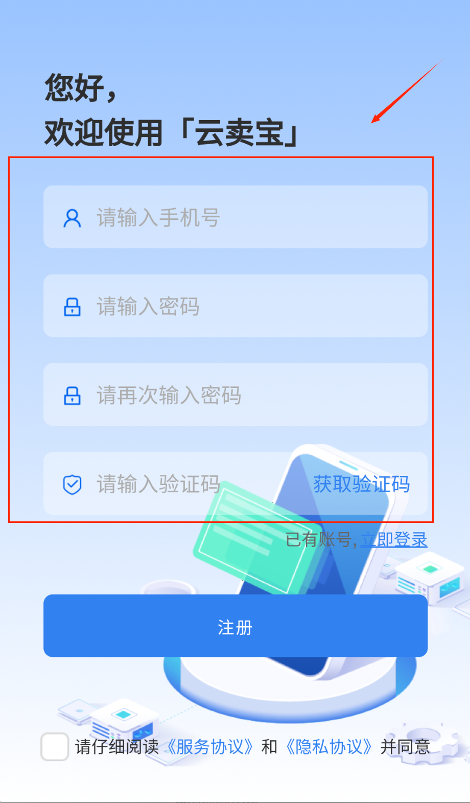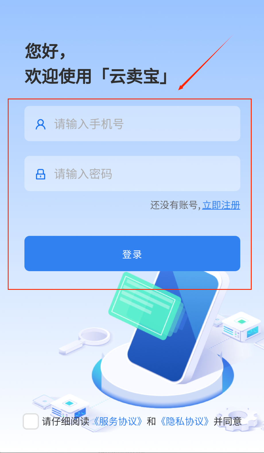 1、打开APP进入登录页,顶部显示时间状态,中间是您好,欢迎使用云卖宝欢迎语呀。点击还没有账号,立即注册进入注册页面哦。
