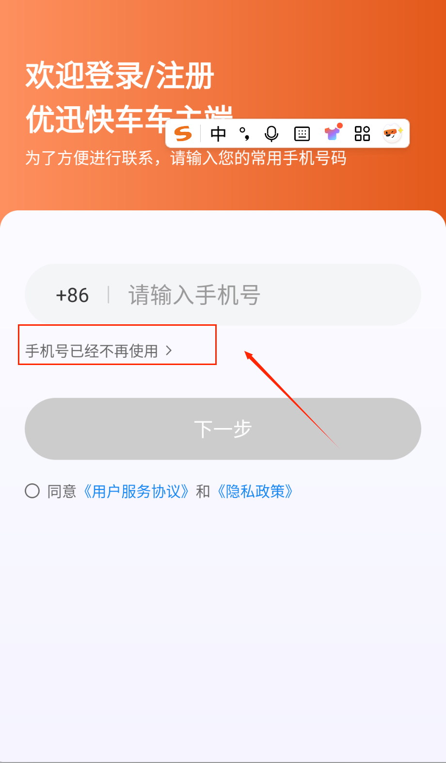 1、 打开车主端看到橙色登录页后,在"+86"开头的输入框里准确填写当前正在使用的手机号码,注意别把数字输错啦。