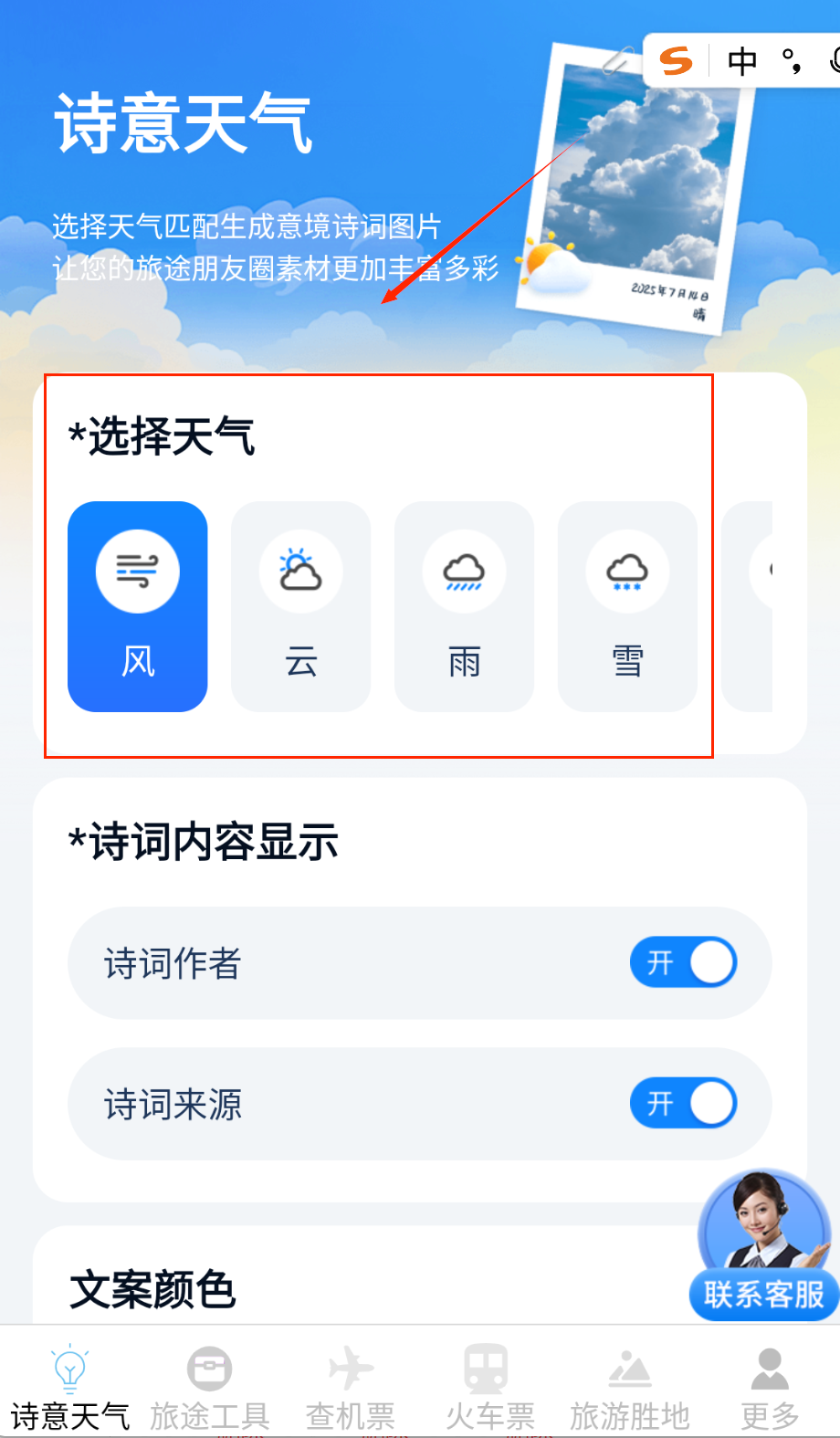 1、诗意天气功能将枯燥的天气预报转化为图文结合的诗词卡片,用户可自由调整文案风格与布局,分享至社交平台增添旅行趣味。