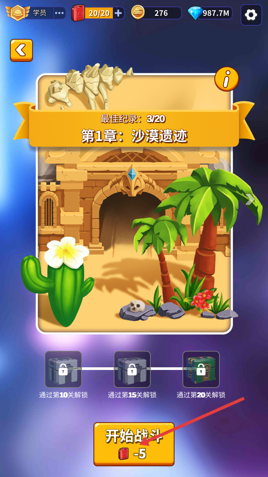 1、进入【第1章-沙漠遗迹】,点击【开始战斗-5】消耗体力,开启关卡挑战,推进章节进度。