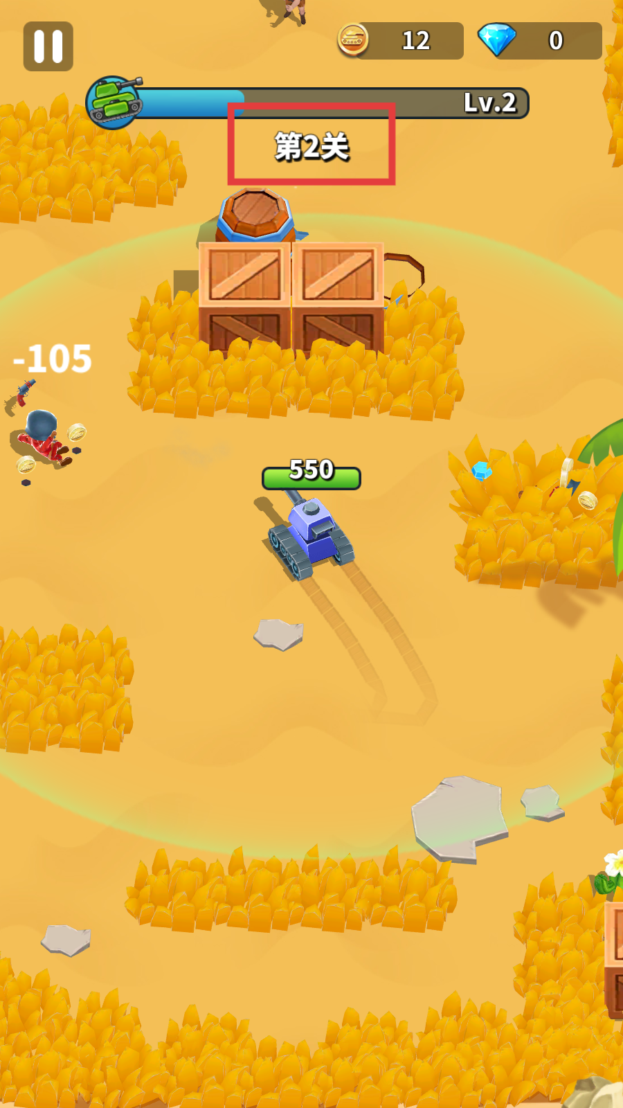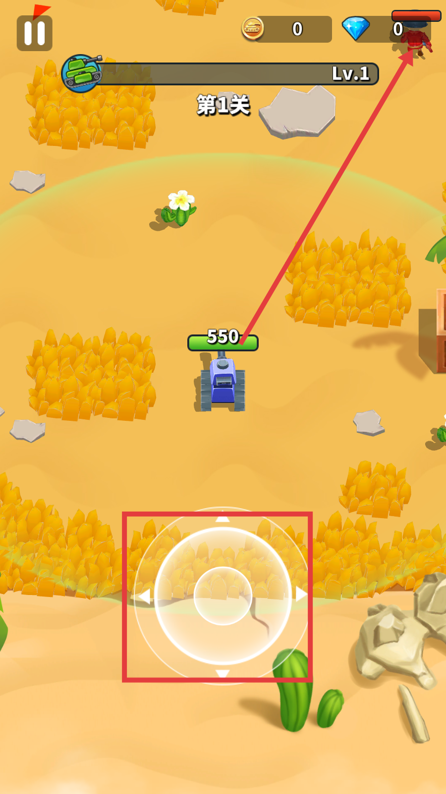 2、在【第1关】用虚拟摇杆操控坦克移动,瞄准并攻击敌方单位,积累战斗经验提升等级。