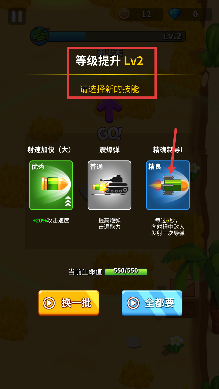 3、等级提升至【Lv2】后,选择【精确制导I】等新技能,增强坦克的战斗能力助力闯关。