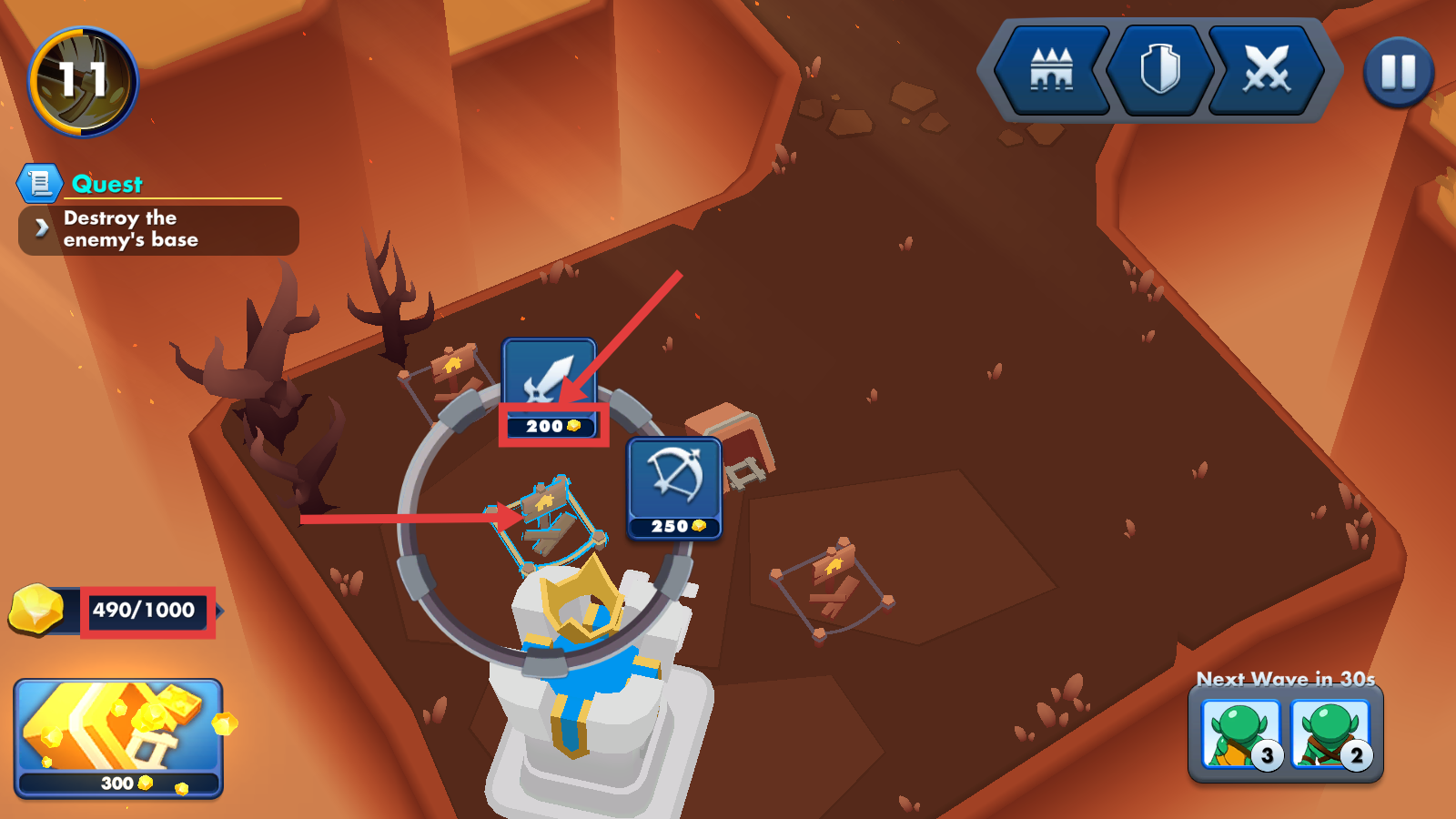 2、战斗中消耗200金币部署剑形单位,同时收集金币,将进度推进至【490/1000】,积累资源强化战力。