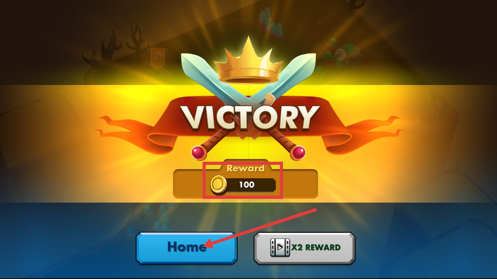 4、成功获胜后,领取100金币奖励,点击【Home】按钮返回主界面,结束本关挑战。