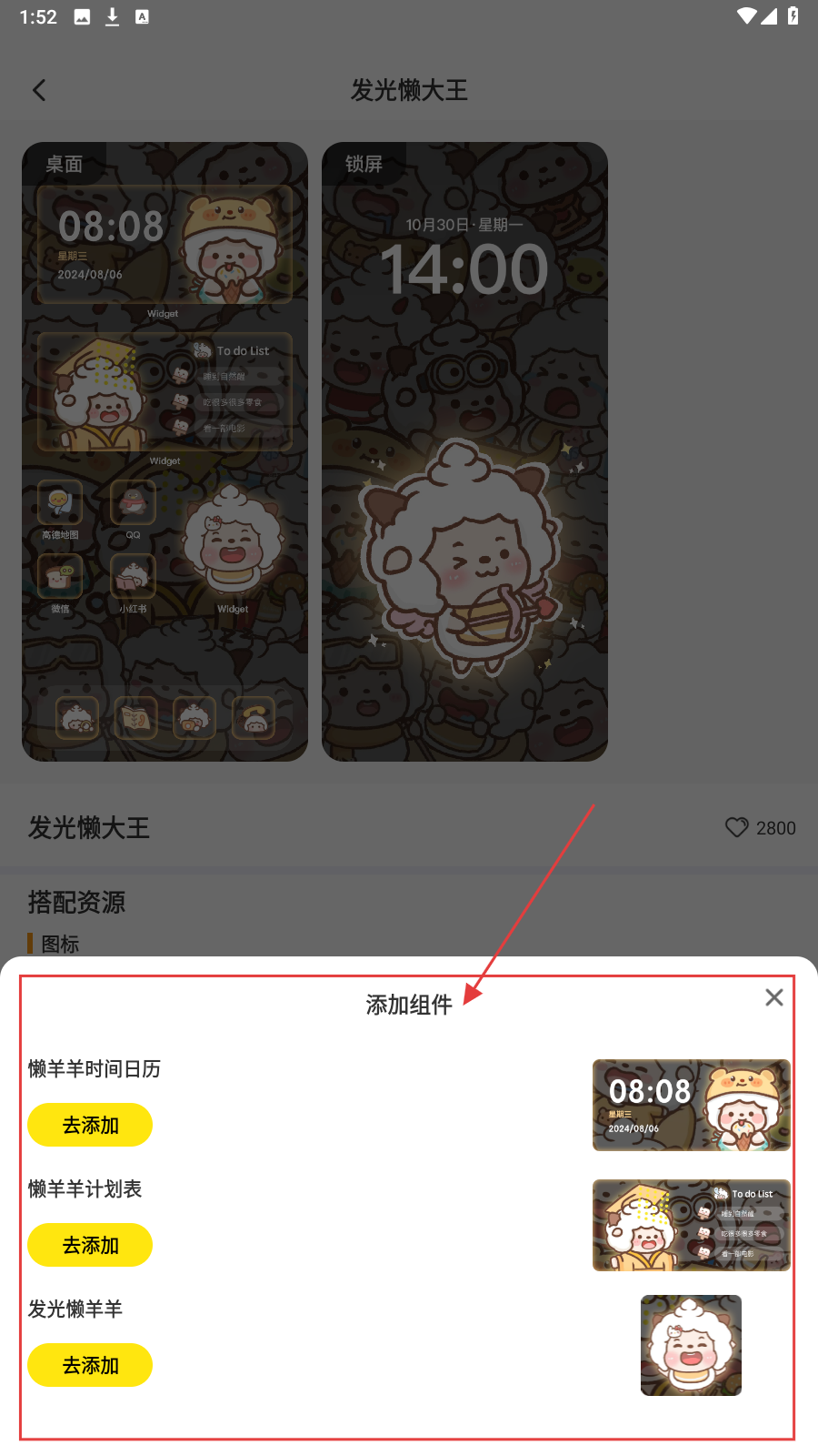 4、主题应用完成后,点【添加组件】,选择【懒羊羊时间日历】等组件进行添加。