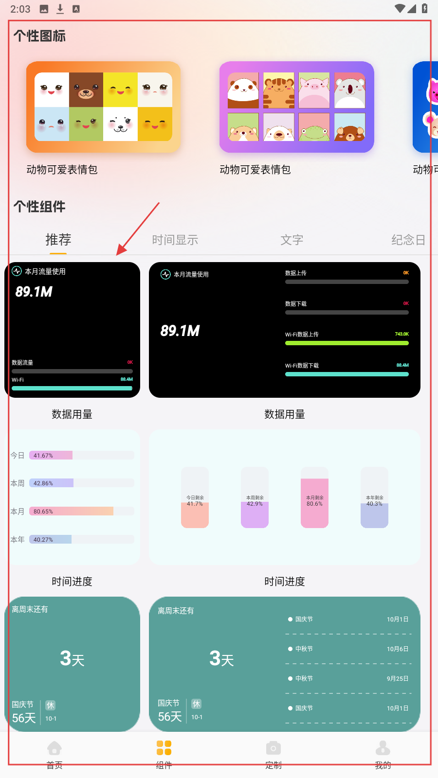 3、切到组件页,浏览【个性图标】【个性组件】等,挑选样式。