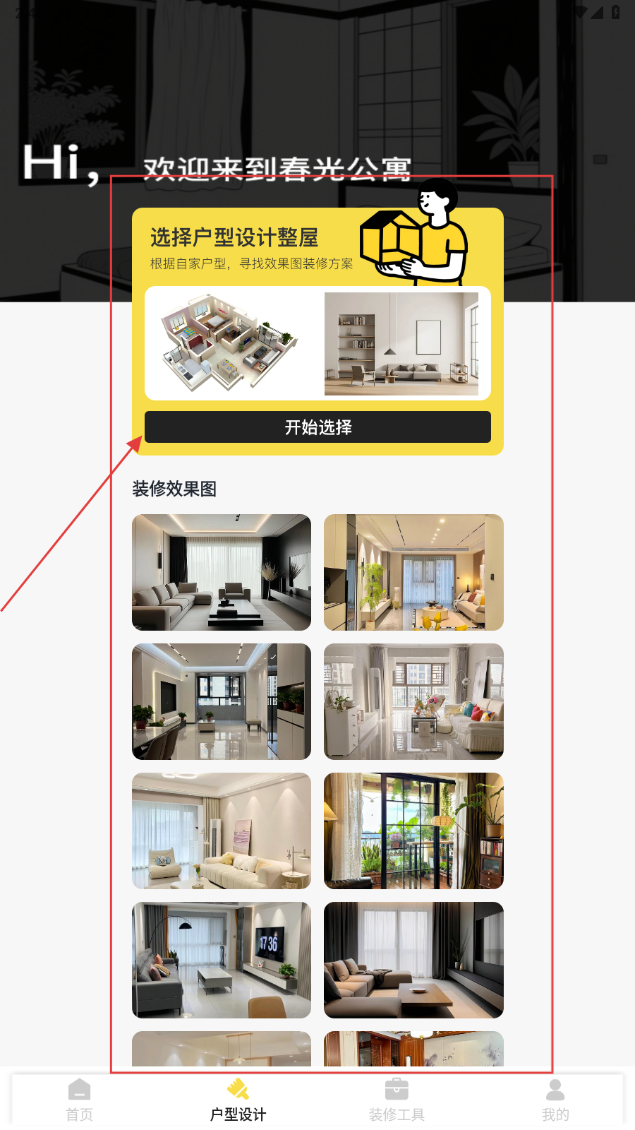 1、进入户型设计界面,点击【开始选择】,根据需求选整屋装修方案。