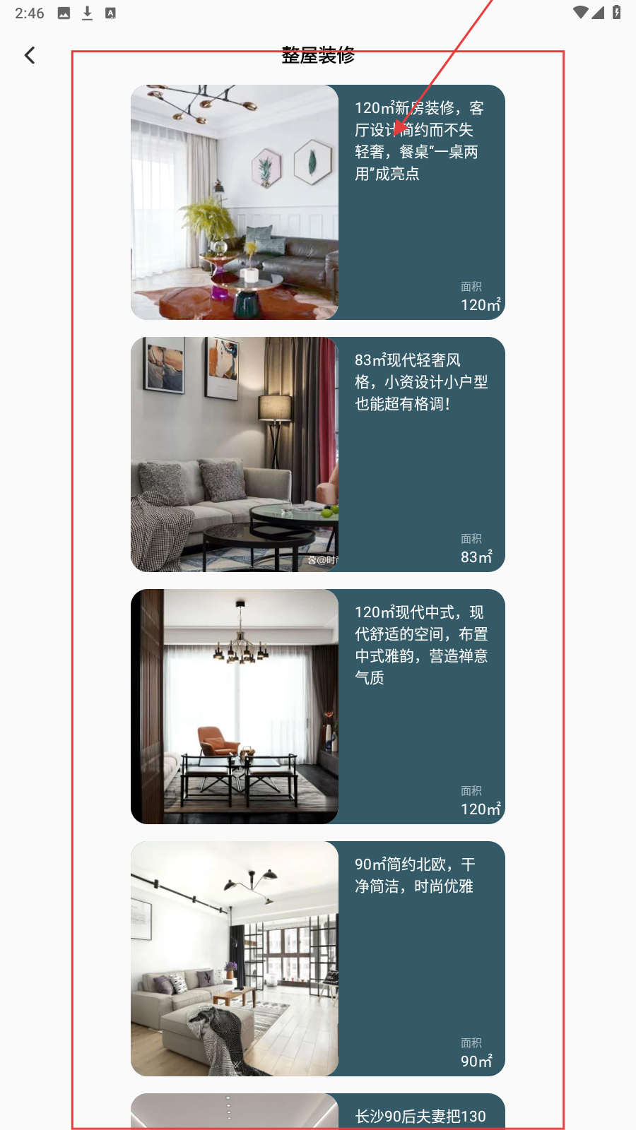 2、在整屋装修列表,挑选感兴趣案例(如120㎡新房装修),查看详情。