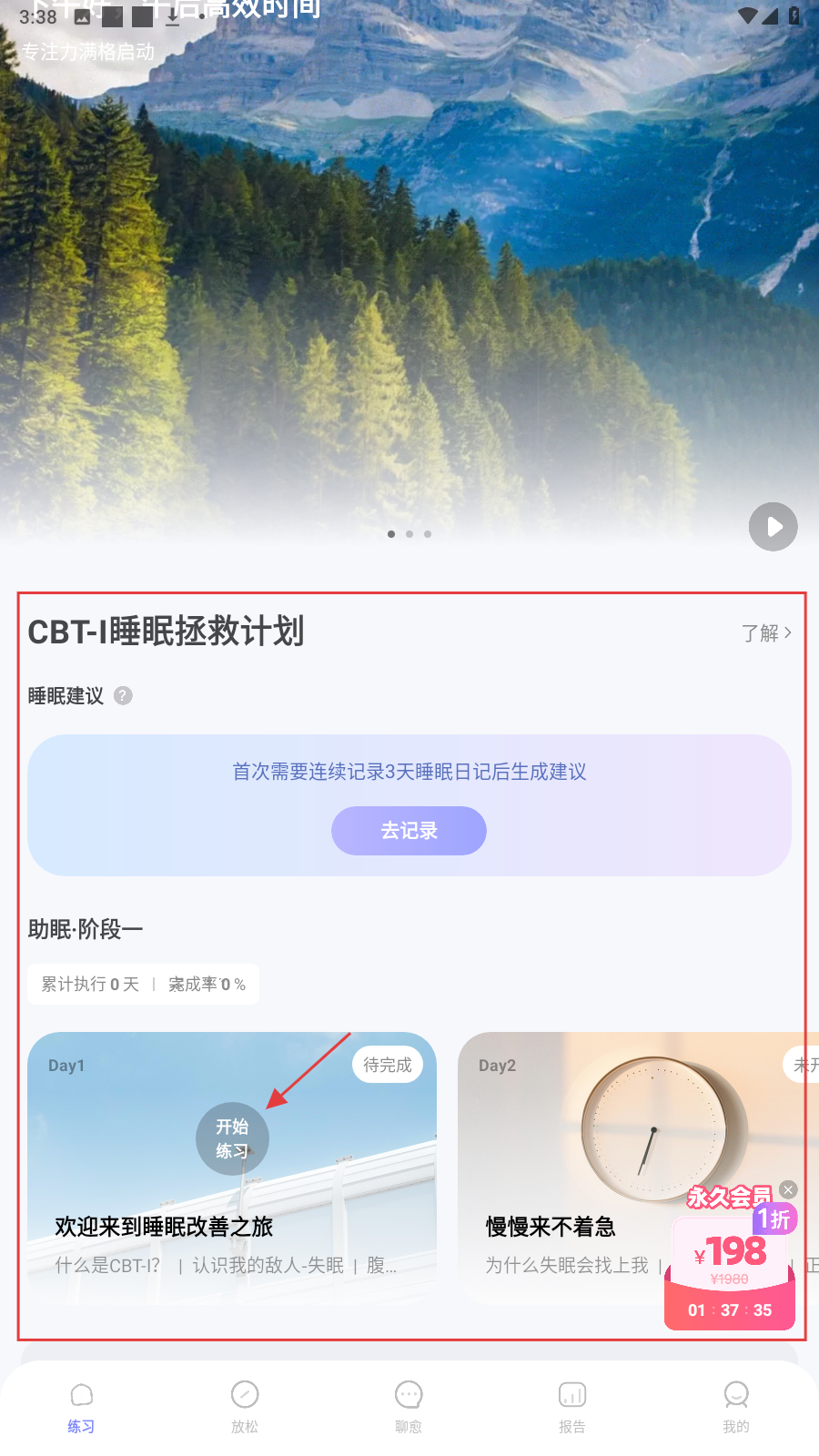 1、进入【练习】页,参与【CBT-I睡眠拯救计划】,点【开始练习】进入训练内容页。